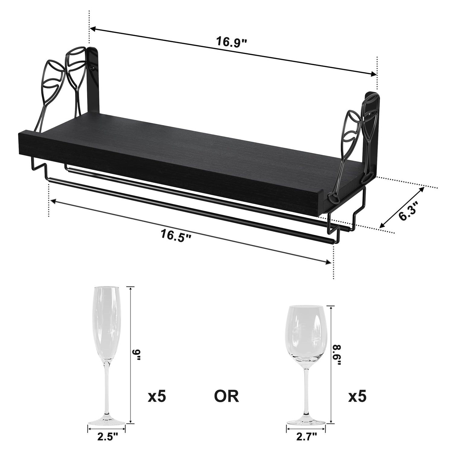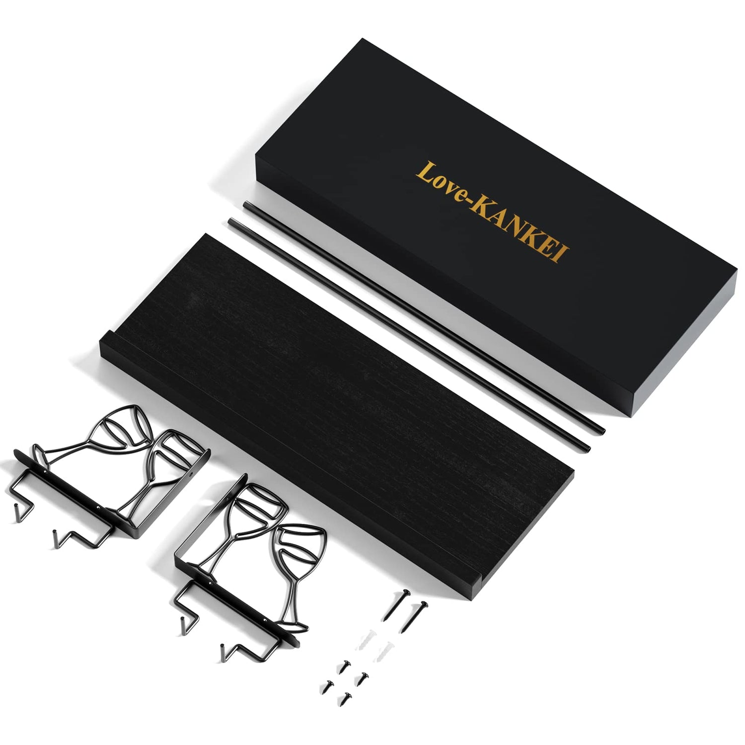 Love-KANKEI Wine Rack with Stemware Hanger, 17inch Wine Glass Rack, Floating Shelf Wall Mounted, Wood Wall Shelf for Kitchen, Dinning Room, Home Bar, Living Room etc, Pitch Black