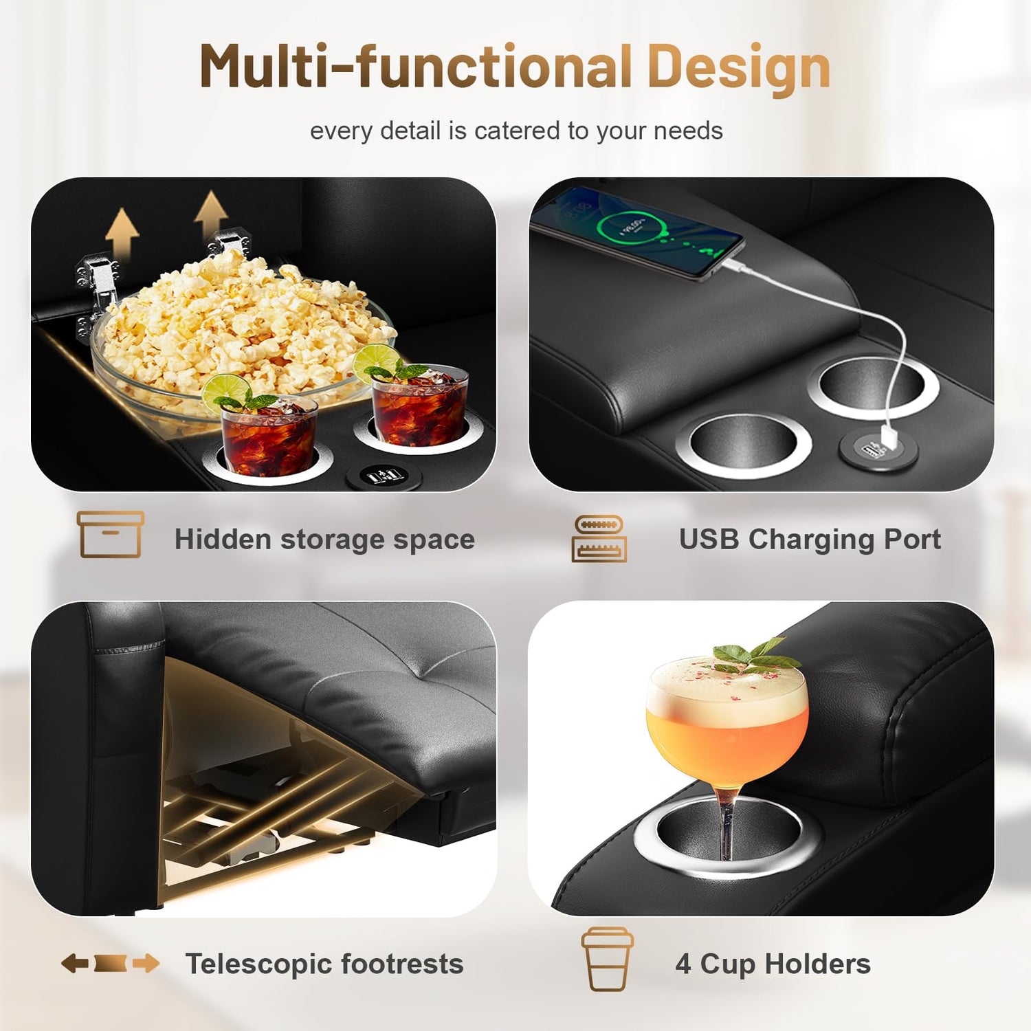 - All-in-One Multi-Functional Recliner Sofa: This dual recliner sofa is built for comfort and function—featuring a center console with dual cup holders, USB charging port, and hidden storage for remotes and snacks. Its wall hugger recliner design saves space, making it ideal for RVs, small apartments, and movie rooms. Whether you're relaxing on a compact recliner couch, upgrading your RV couch with cup holders, or creating the ultimate dual seat recliner for watching TV, this is the seat built to impress