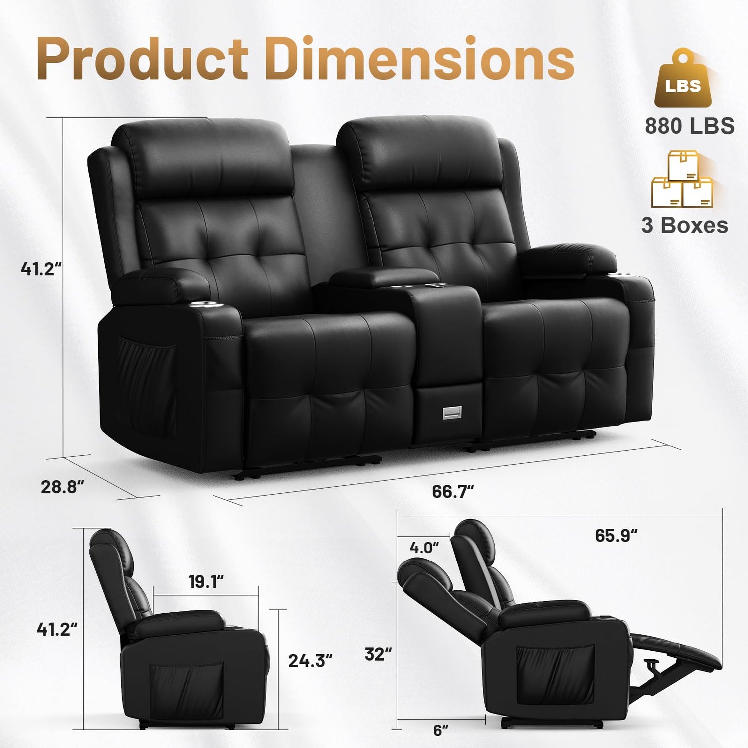 Loveseat Recliner Sofa, Home Theater Seating Massage Reclining Couch with USB, Center Console, Wall Hugger RV Recliners, 145° Adjustable Recline & Cup Holders & Side Pockets,for RV & Movie Room