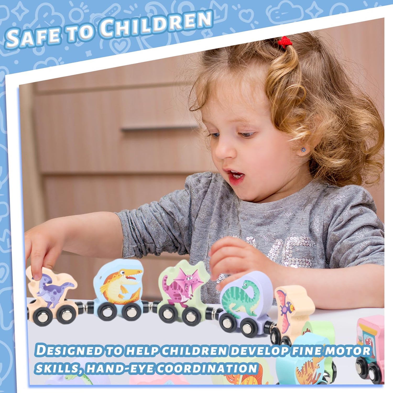 - Safe to Children: Crafted from premium natural wood, this train set for kids are not only safe but also designed for long-lasting use. The toys have a water-based coating, ensuring child safety and environmental friendliness. The smooth edges prevent any harm to a toddler's skin.