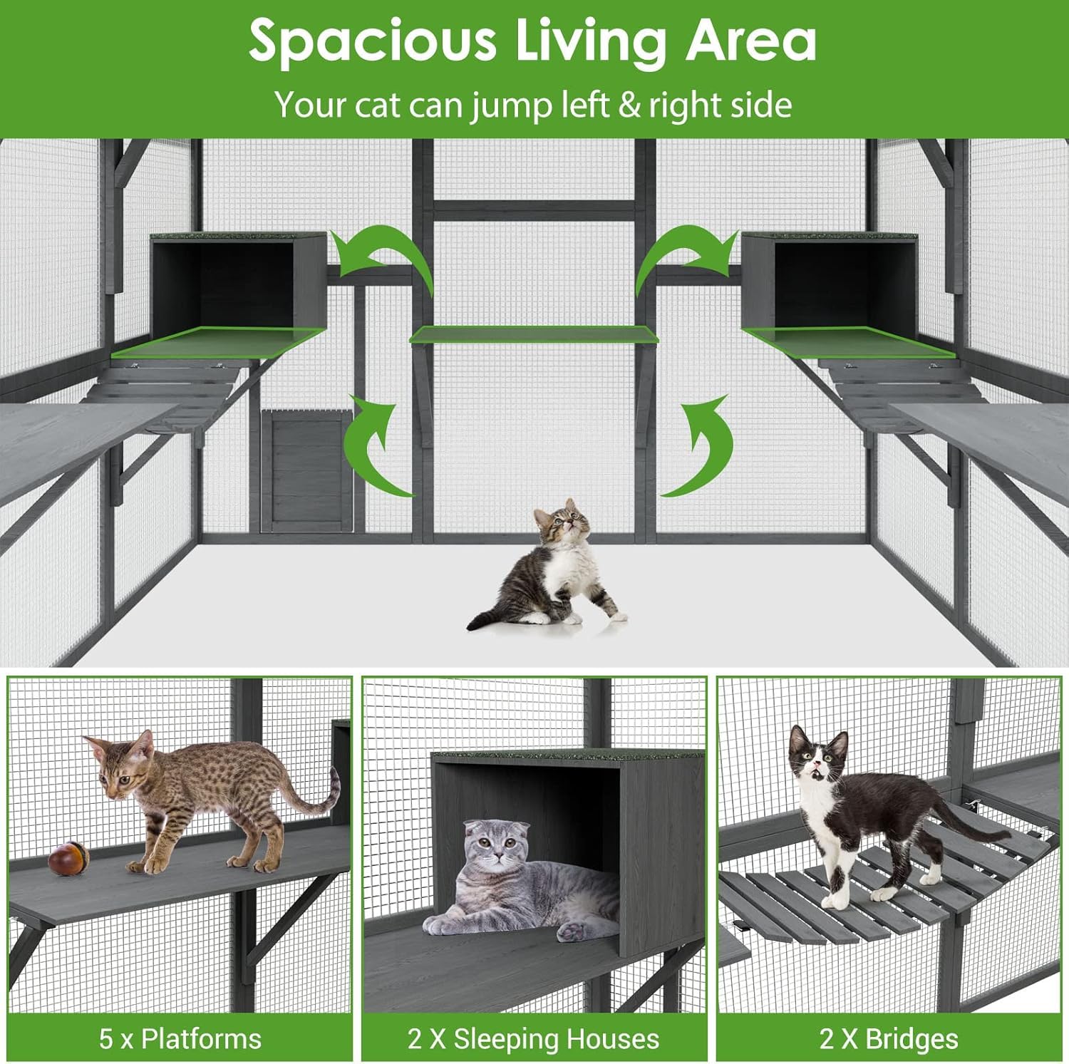- 【Multifunctional Cat House】Our cat house enclosure isn't just a large empty space, it also comes equipped with several features designed to keep your cats entertained and happy. There are 2 bridges that satisfy your cat's instinct to jump and climb, 2 sleeping houses where they can rest and nap in the sun, and 5 cat walks that allow them to jump from left to right. The resting rooms provide a cozy place for your cats to relax, while the cat walks encourage them to be active and playful.