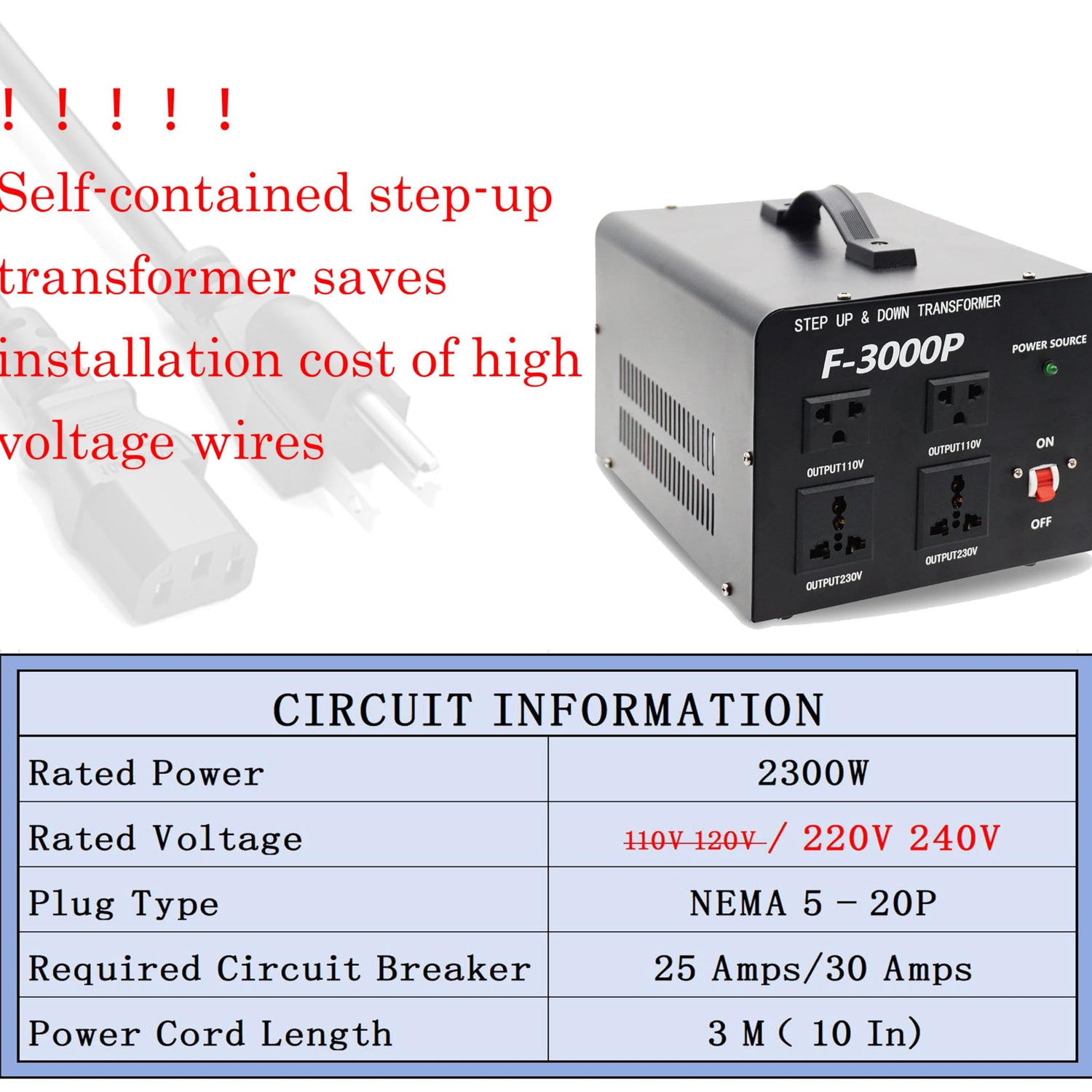 - ❗❗❗ [Self-contained transformer]:The outdoor 5-person size sauna uses 2300 watts of high output power, please make sure you have 240V output wiring at home before purchasing, Or just use the transformer that comes with the sauna. (must be 3000 watts or higher, 220-240 V) in advance).