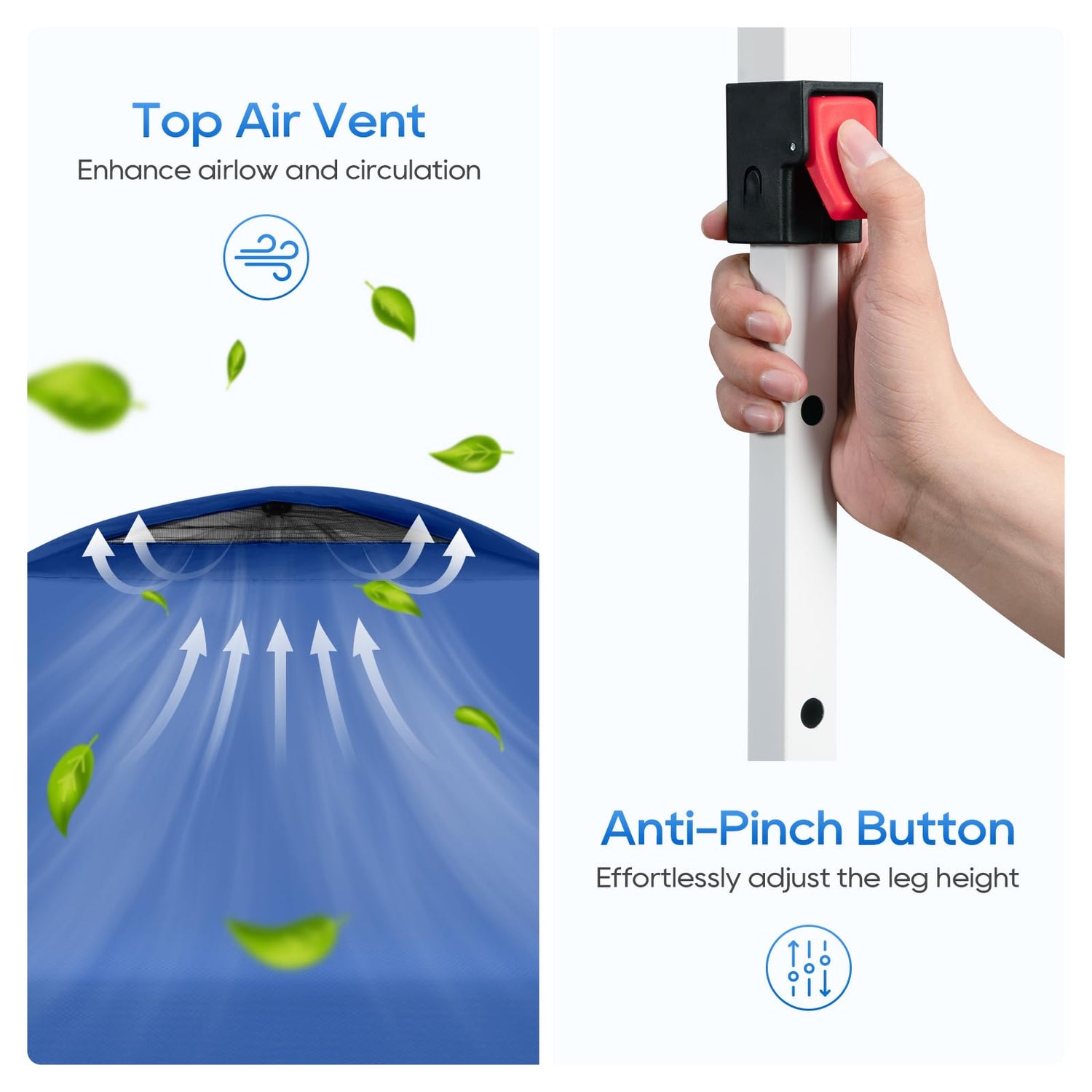 - 【One Person Setup】 This portable shade canopy features patented one-push tent lock system for quick and seamless setup. Simply push the central hub to lock out all legs effortlessly. Then adjust 3 preset heights with soft pinch-free buttons