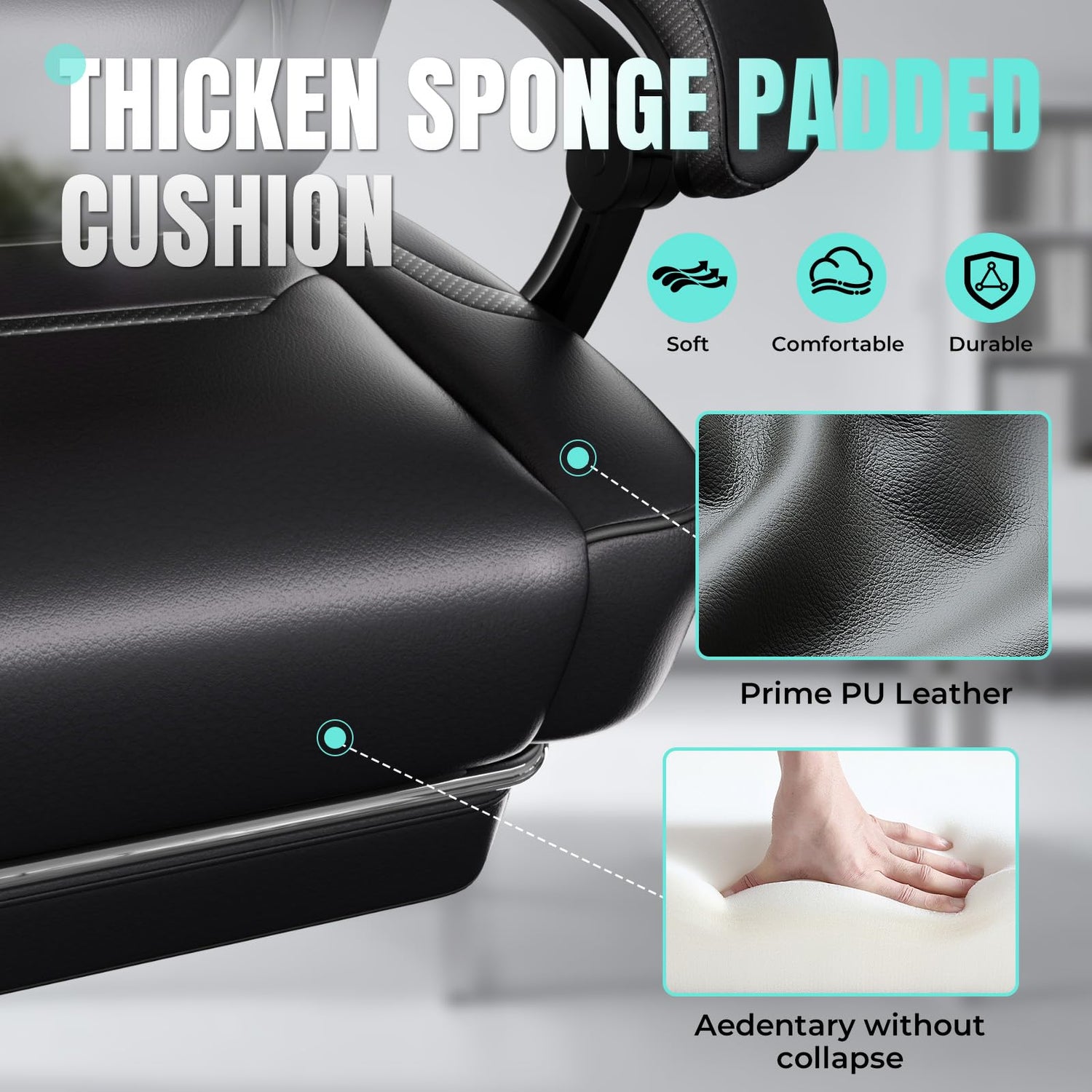 • GAMING CHAIR WITH FOOTREST: Solid integrated frame, international standard gas lift, skin friendly Pu leather with high density thick sponge inside, 5 point steel base with heavy duty, smooth rolling casters, retractable footrest for rest.