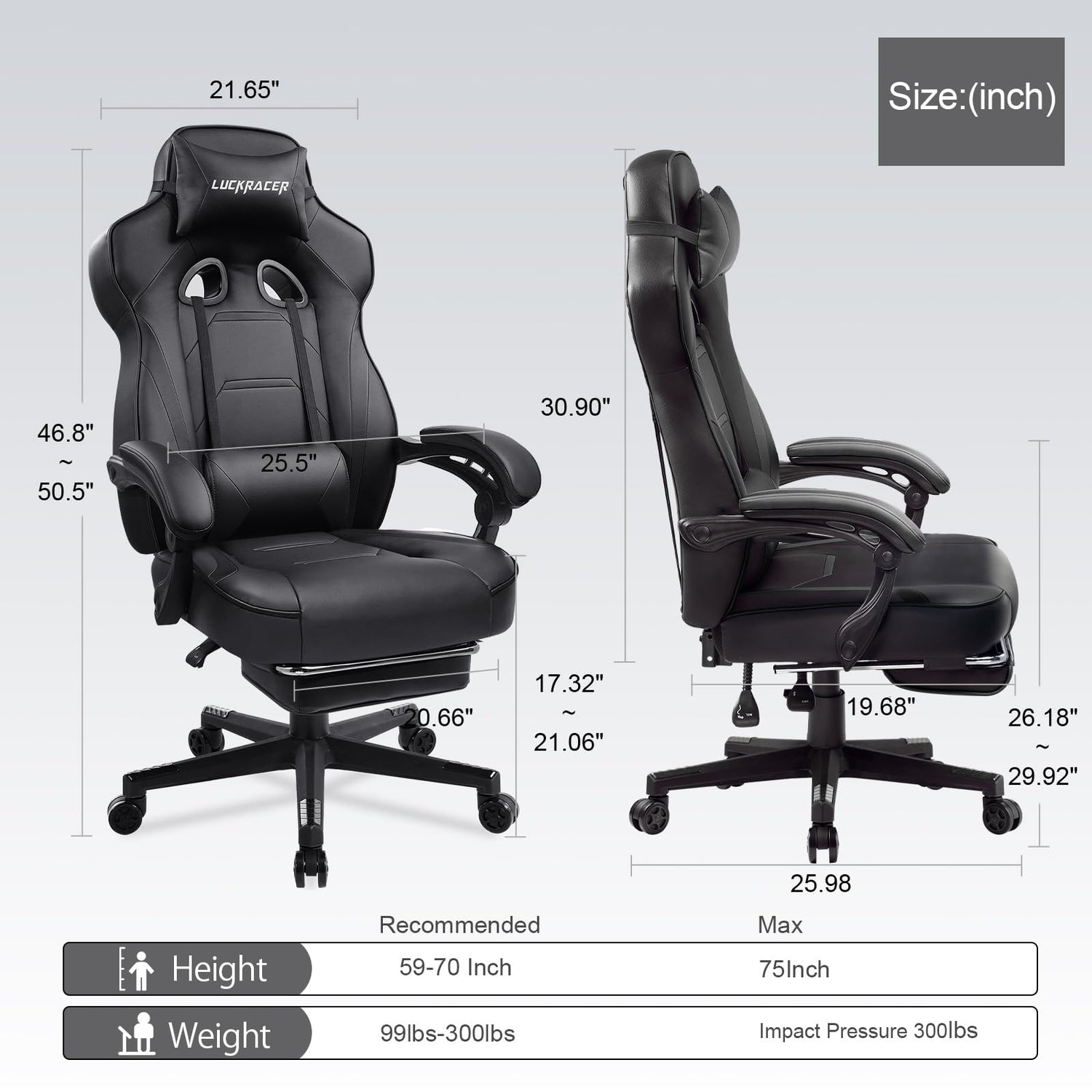 • PERFECT FOR GAMING: We're dedicated to making the best game chairs for pro gamers. Choose Luckracer and improve your gaming experience! Sitting Area Dimensions: 20.86 In(L) x 14.57 In(W); Maximum Weight Capacity: 300 pounds