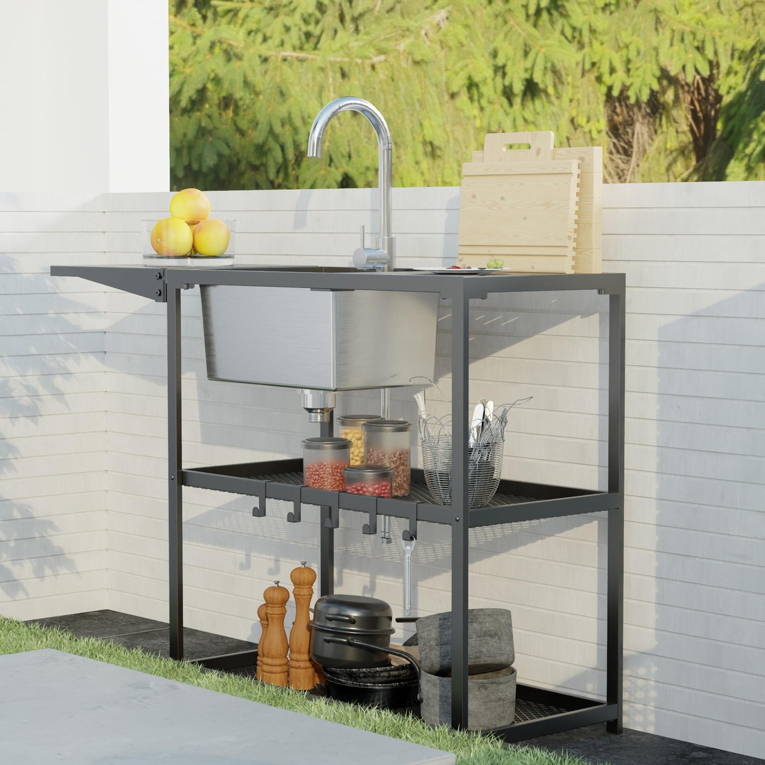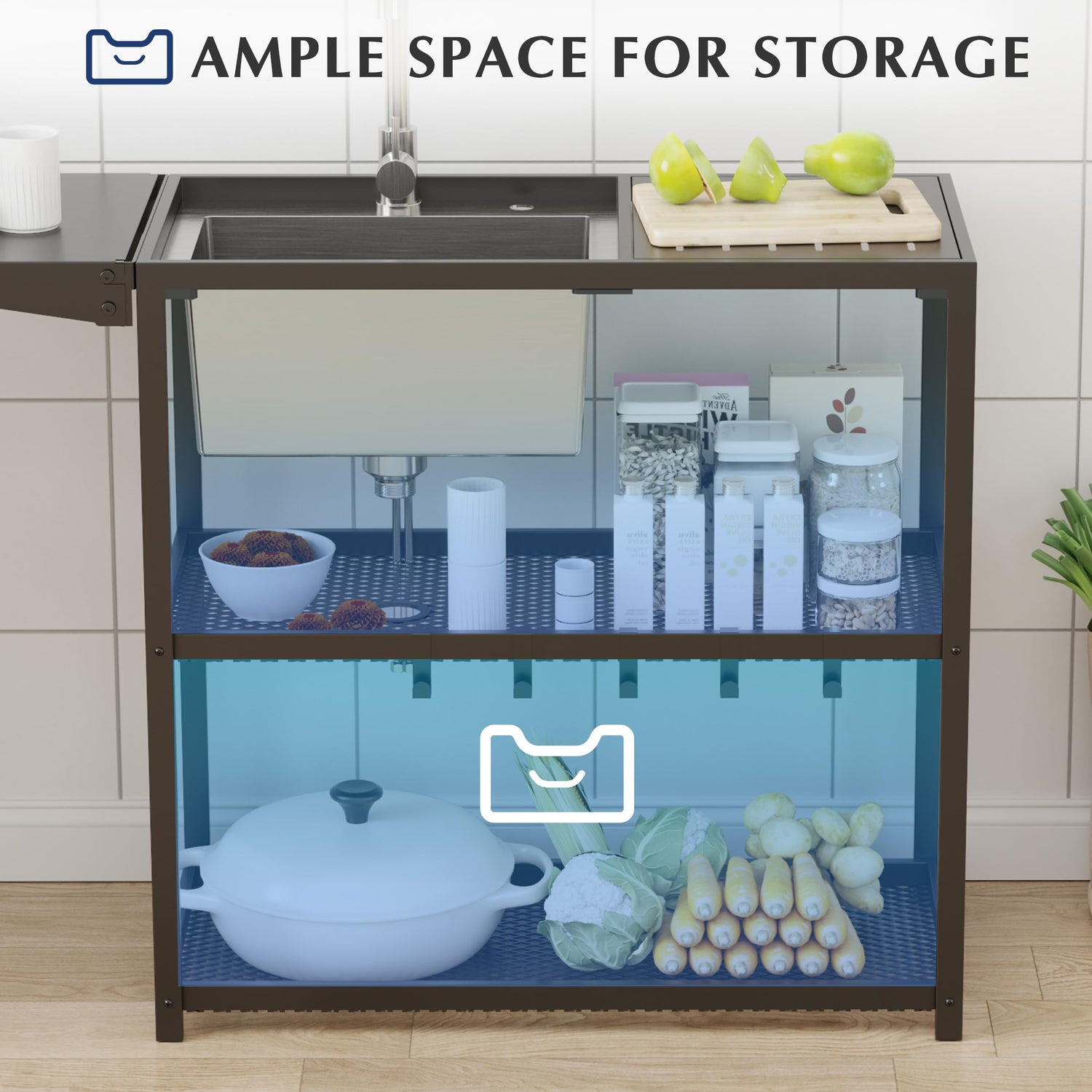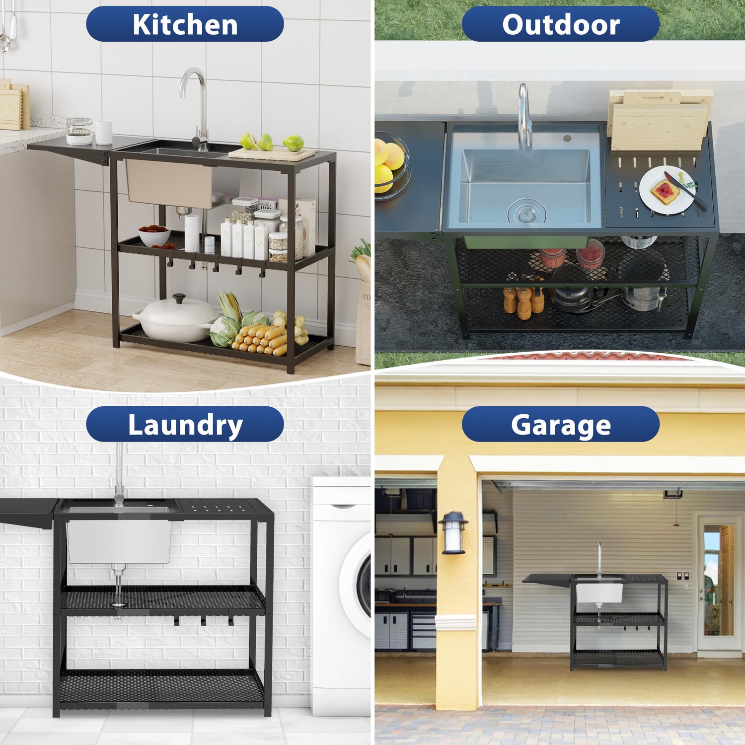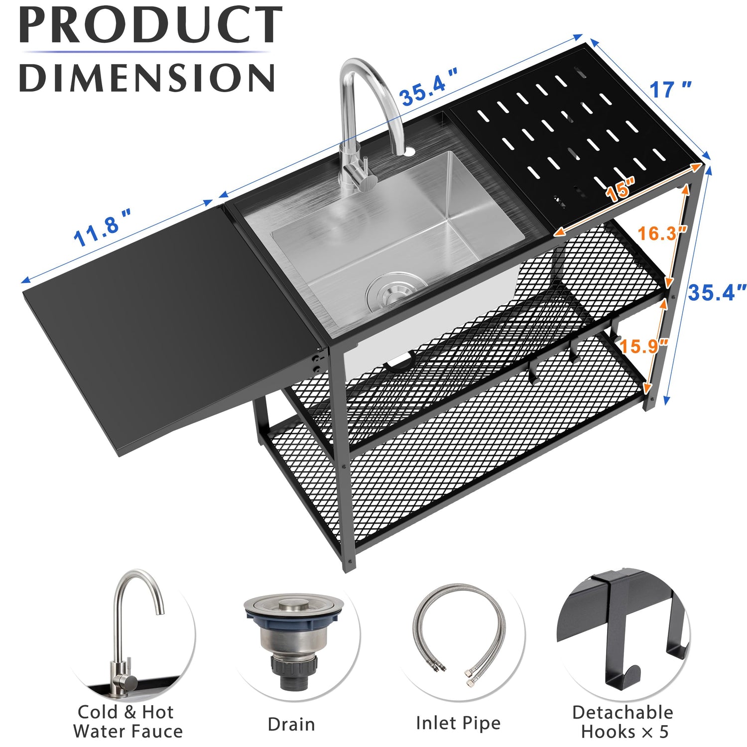 - Extra Foldable Countertop: The freestanding kitchen sink is specially designed with an 11.8" EXTRA foldable countertop on the left side of the shelf, providing additional space for storage and working. You can raise it when needed and pull it down for space-saving when not in use