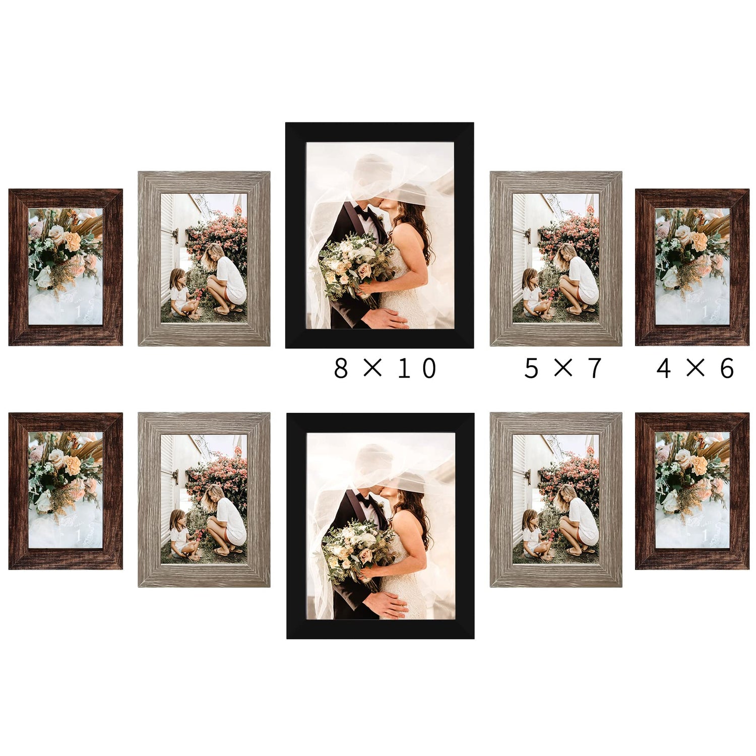 - Multi-size: 10pcs picture frames set come with TWO black frames 8x10in, FOUR gray frames 5x7in and FOUR wood grain brown frames 4x6in. Just remember to peel off the protective film on both sides of the plexiglass.