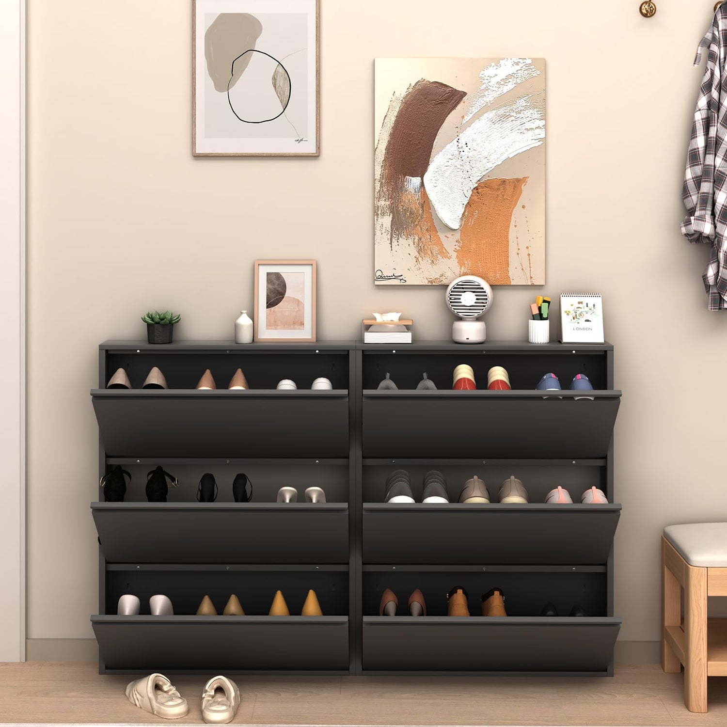 - 【Metal Wall Shoe Cabinet】Overall sizes: 31.5”W x 6”D x 43.01”H. This multifunctional wall shoe cabinet with 4 flip drawers offering ample space to meet your family's needs., Its modular design not only stores shoes but also expands to accommodate other small items like keys, wallets, or accessories, making it a perfect shoe storage cabinet for any home.