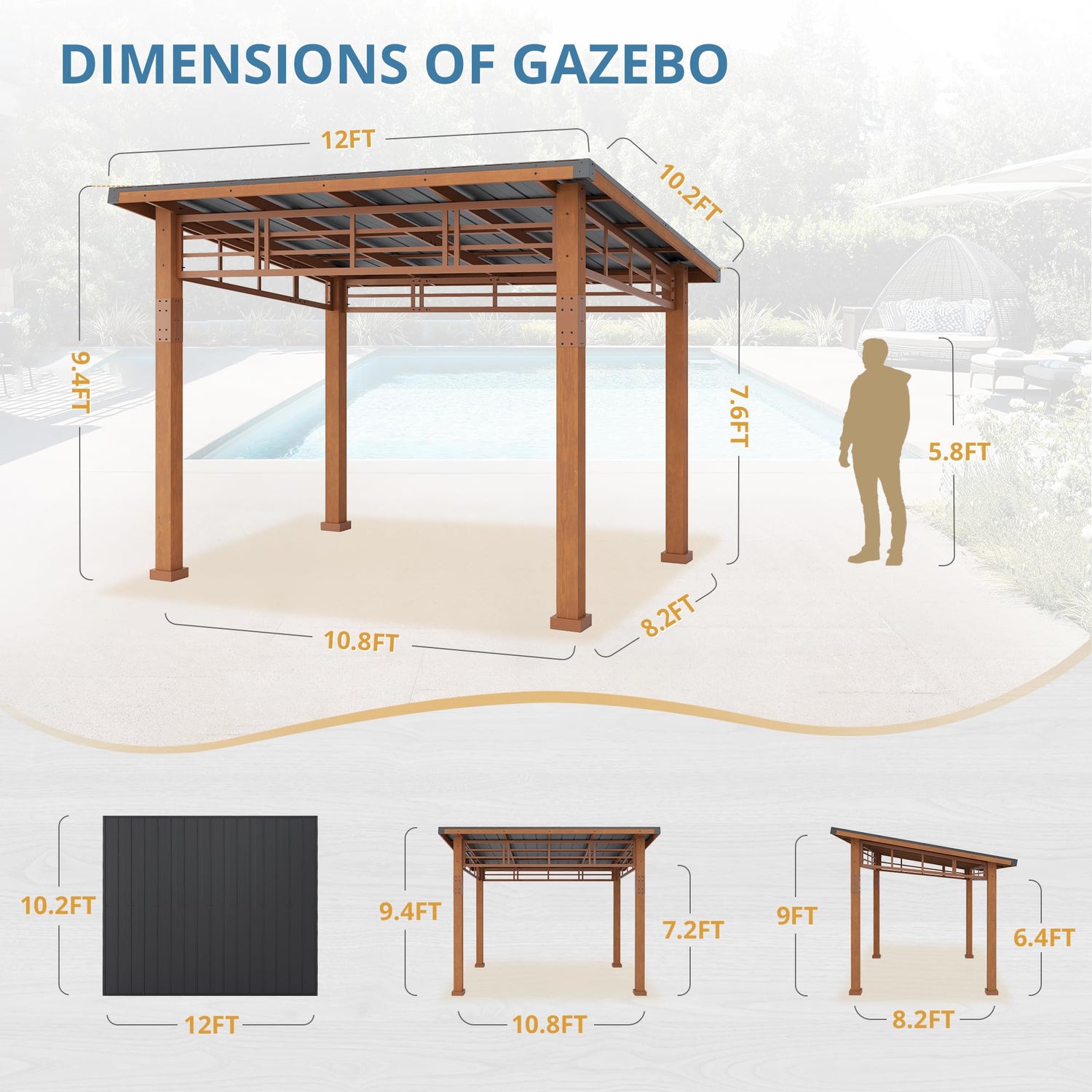 - Large Space Pergola: The gazebo measures 10' L x 12' W x 9.3' H, suitable for dining table set for six to ten person; this outdoor metal gazebo canopy is suitable for many occasions, ideal for outdoor barbecues, parties and outdoor living rooms