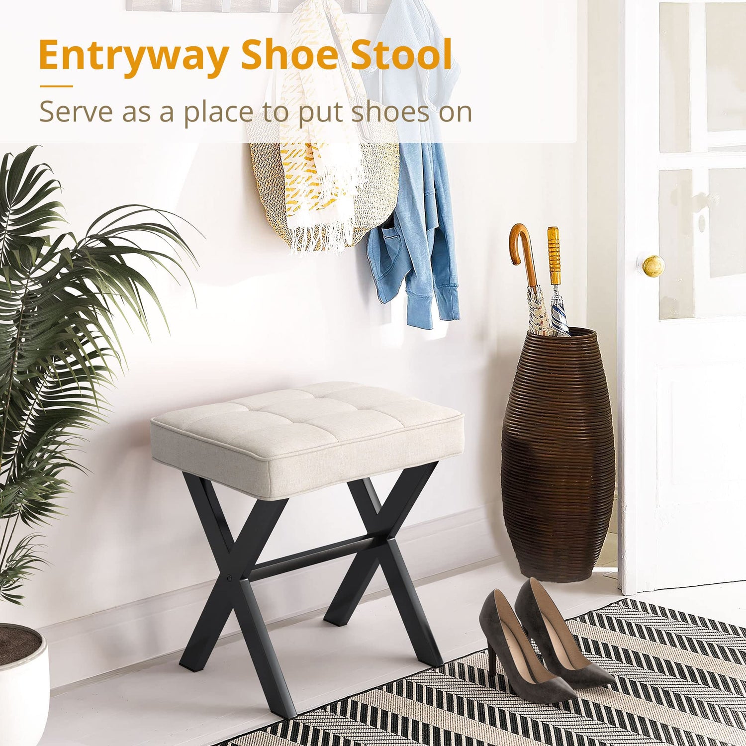 LUE BONA Ottoman Foot Stool Vanity Stool, Square Linen X-Leg Foot Rest Ottoman Makeup Stool, Small Stool Chair for Vanity, Modern Padded Vanity Seat for Makeup Room, Living Room, Bathroom, Linen Color