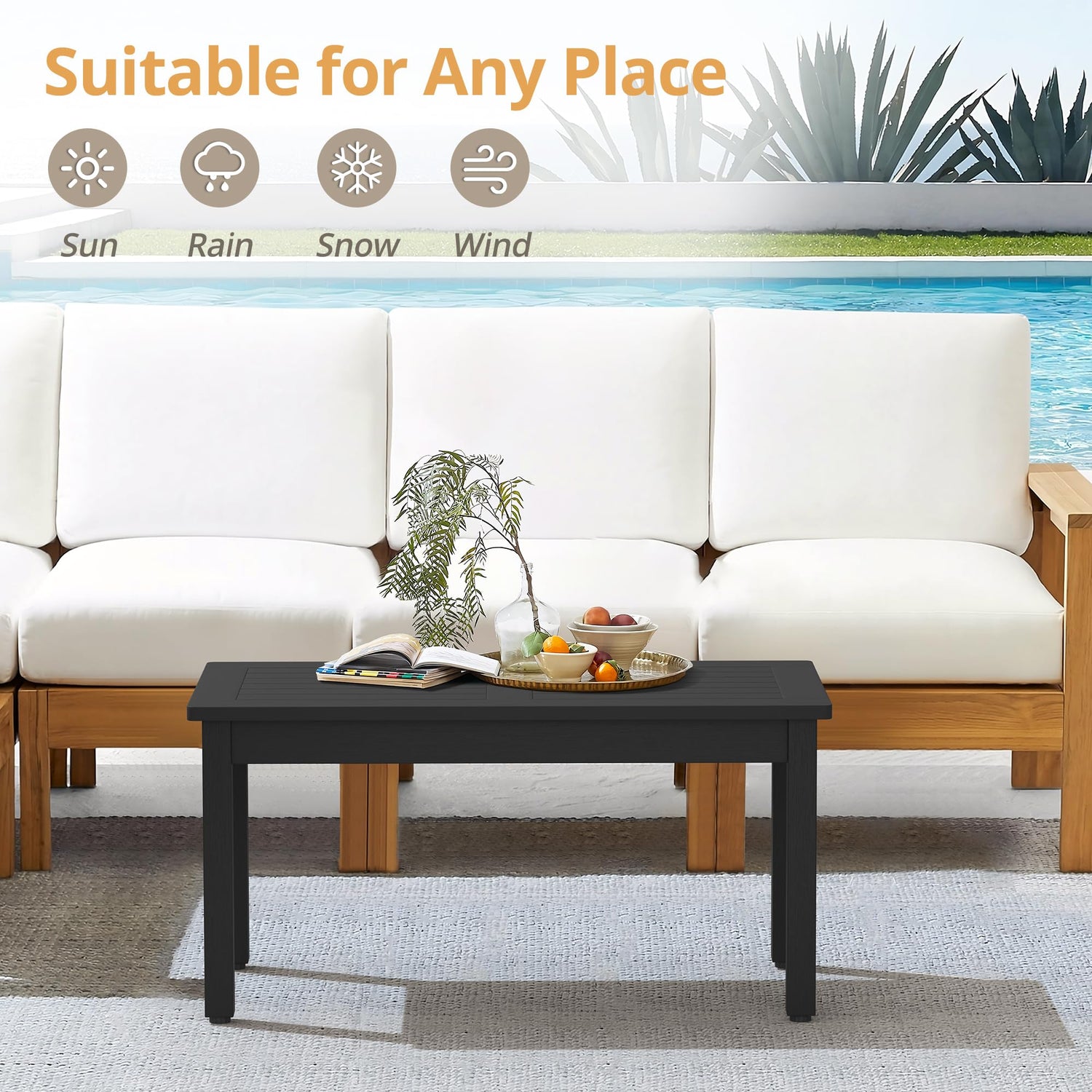 - HDPS: Crafted from HDPS, our patio coffee table mimics the beauty of natural wood with a delightfully textured finish and it performs well in terms of water resistance, weather resistance, scratch resistance, stain resistance, and durability