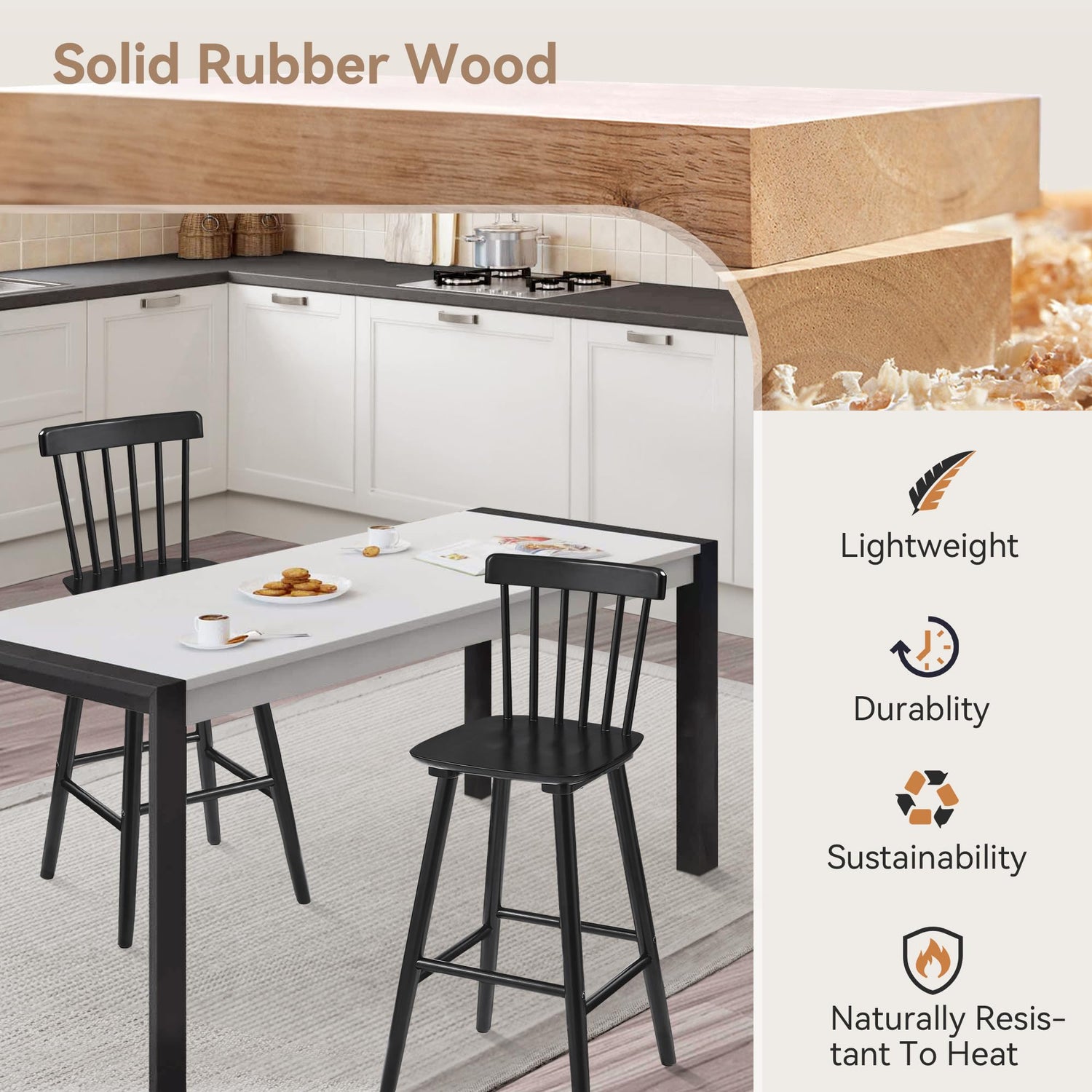 - Durability: Bar stools are constructed from sturdy rubber wood, which enhances its durability and longevity that can support up to 300 pounds; This makes them a wise investment as they can withstand daily use and wear over the years