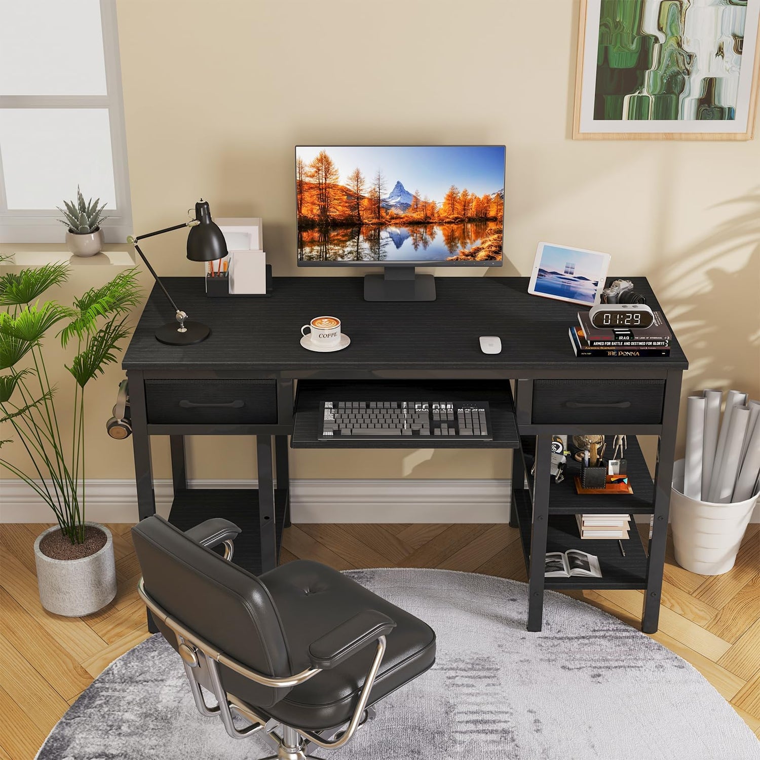 Lufeiya Desk with Keyboard Tray Slide Out, 47 Inch Home Office Computer Desks with Fabric Drawers & Storage Shelves, Modern Simple Study Writing Gaming Table for Bedroom, Black