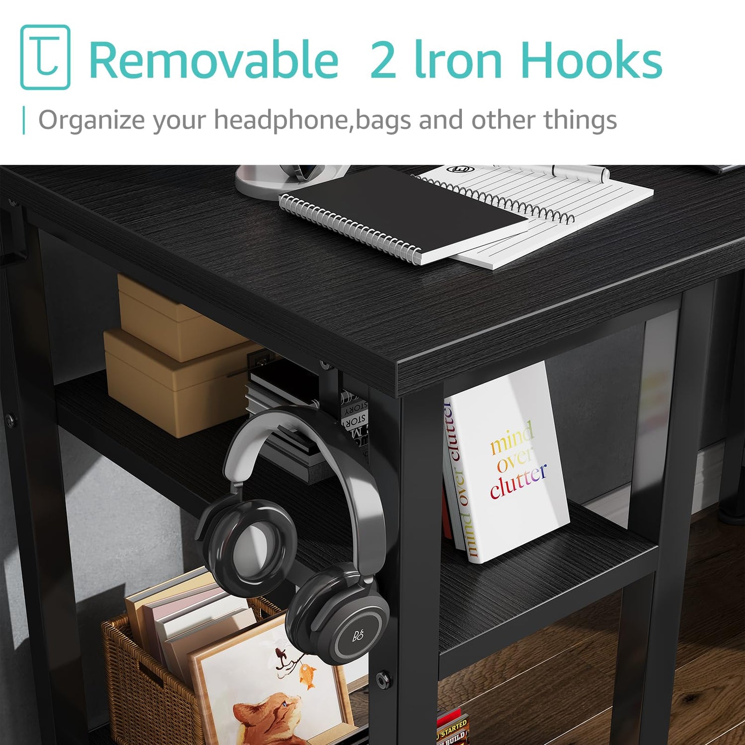 - Working Desk With Ample Storage Options: Computer desk with 2 storage shelves and 4 ๐๐๐๐ง๐๐ ๐ฟ๐ง๐๐ฌ๐๐ง๐จ with wooden front, you can try this two installation methods (left or right), and the shelves have two different heights of installation, you can customize the storage space to your needs. It also have 2 iron hooks, perfect for holding magazines, notebooks, bags or small electronics