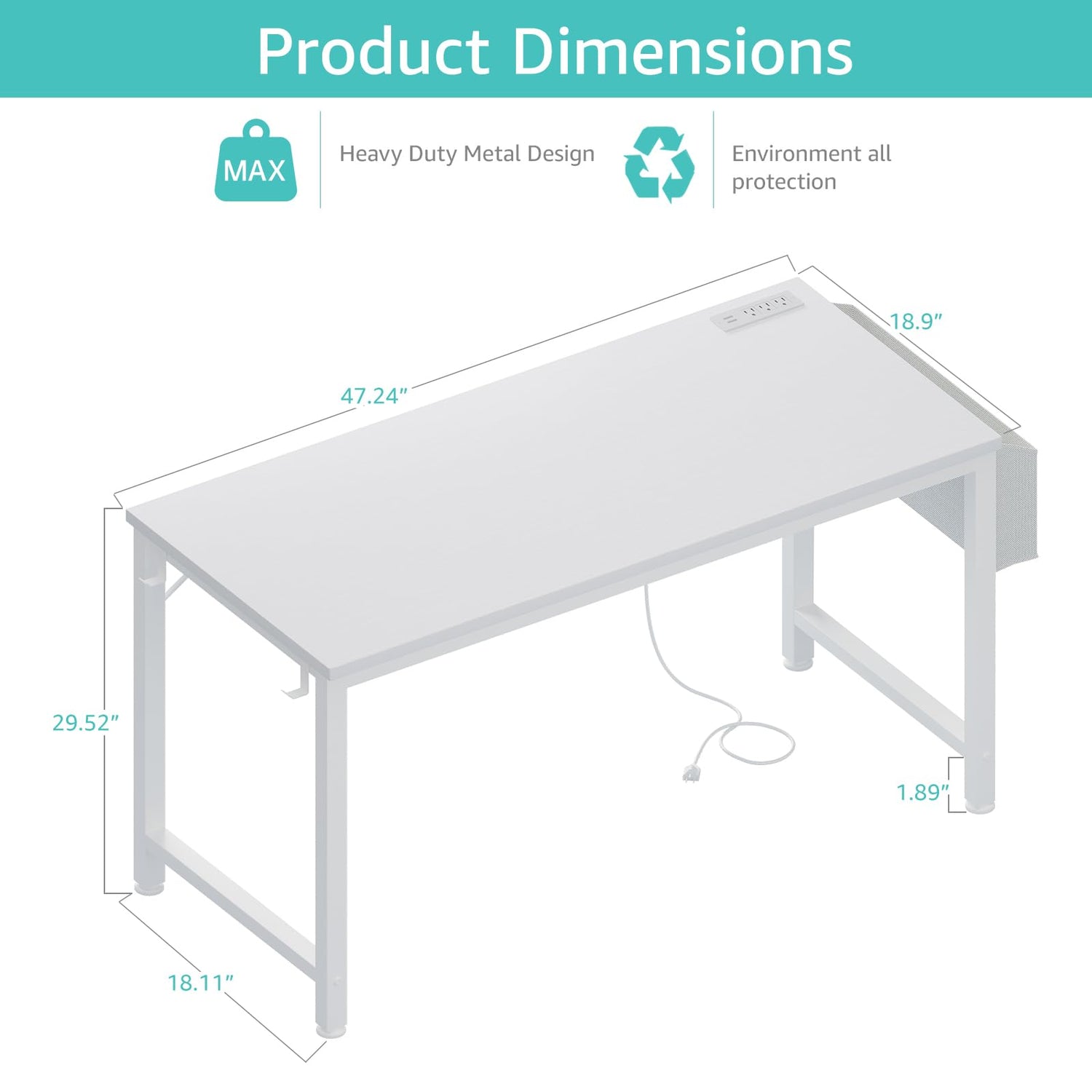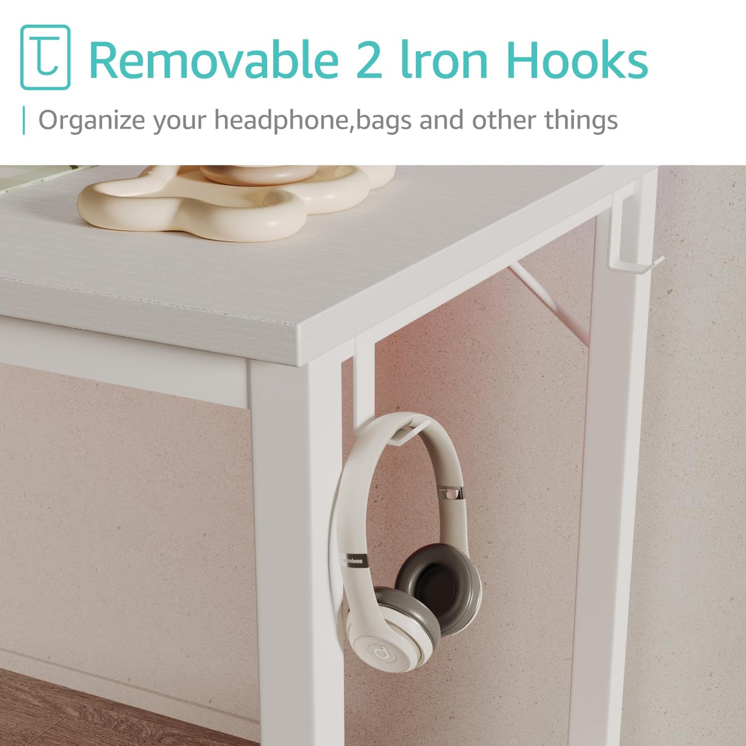 - Modern Simple Style Design: Desk is made of thick Particle board with scratch-resistant, anti-collision and waterproof, protect home office desk surface from daily wear and tear, White desktop match White metal frame, with storage bag and Headphone hook(Both Removable)
