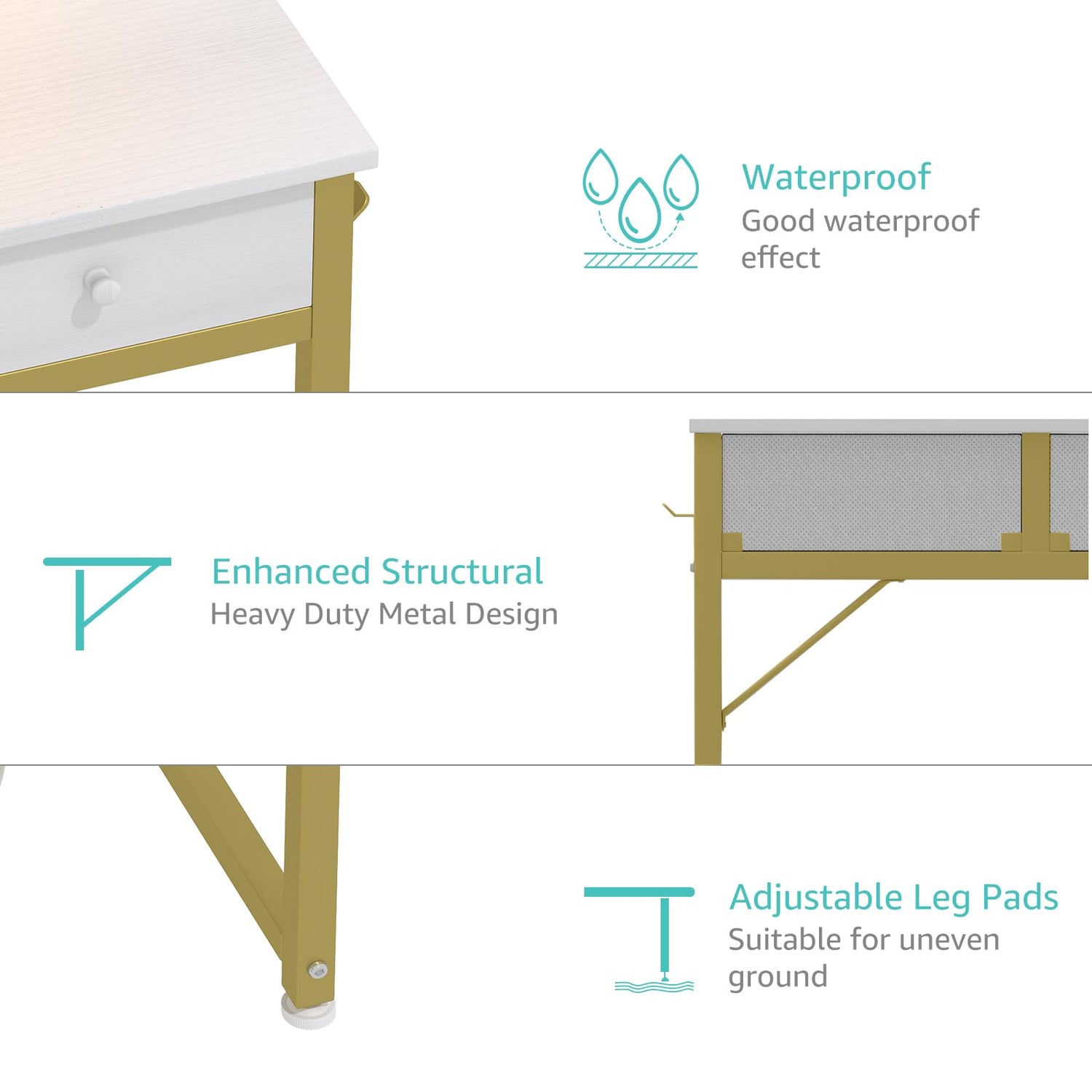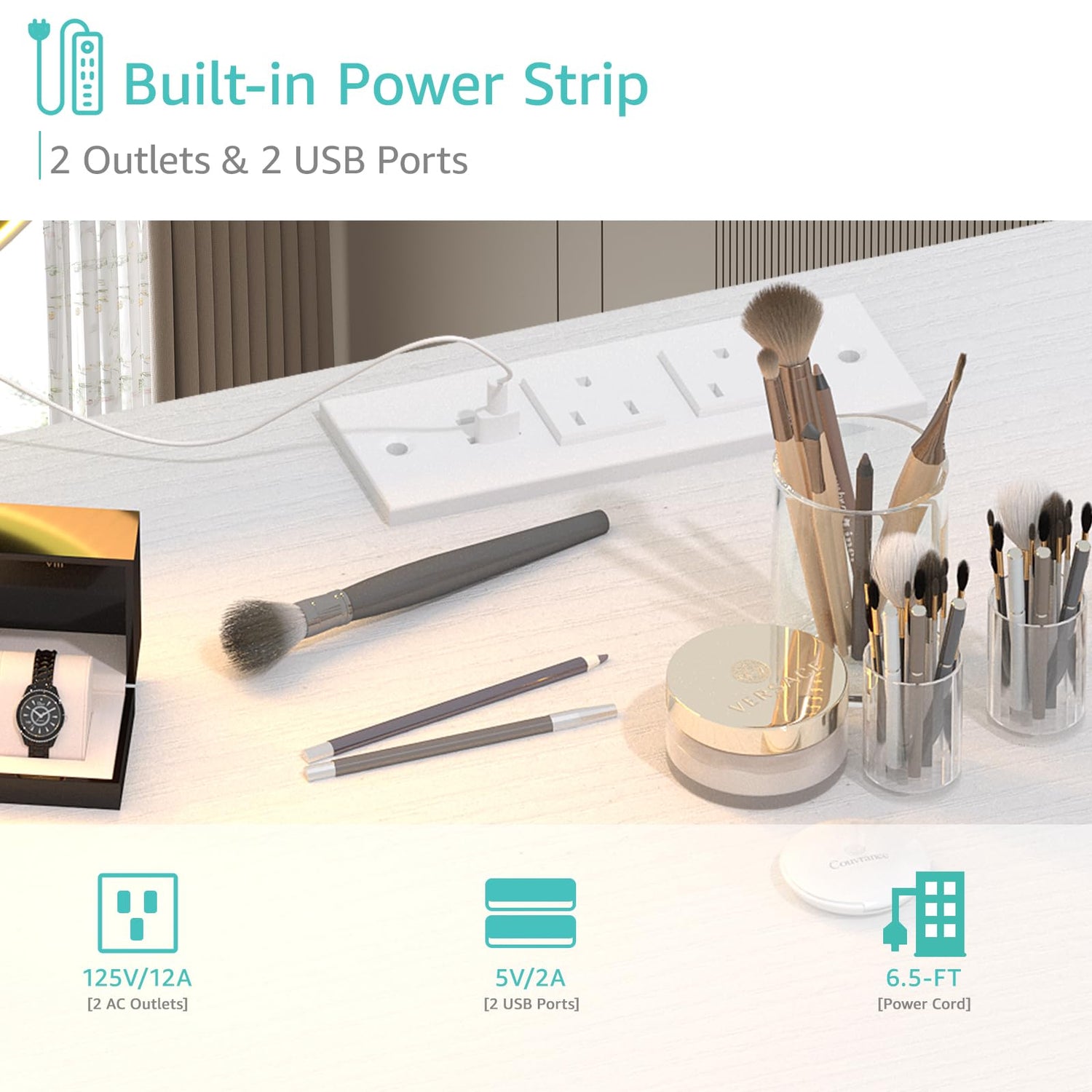 - 【Vanity Table with Charging Station】This makeup vanity table features a power strip, includes 2 standard plug sockets and 2 USB ports, which can be more convenient to connect your hair dryer, curling iron, and it can also charge your phone, tablet or other mobile devices.