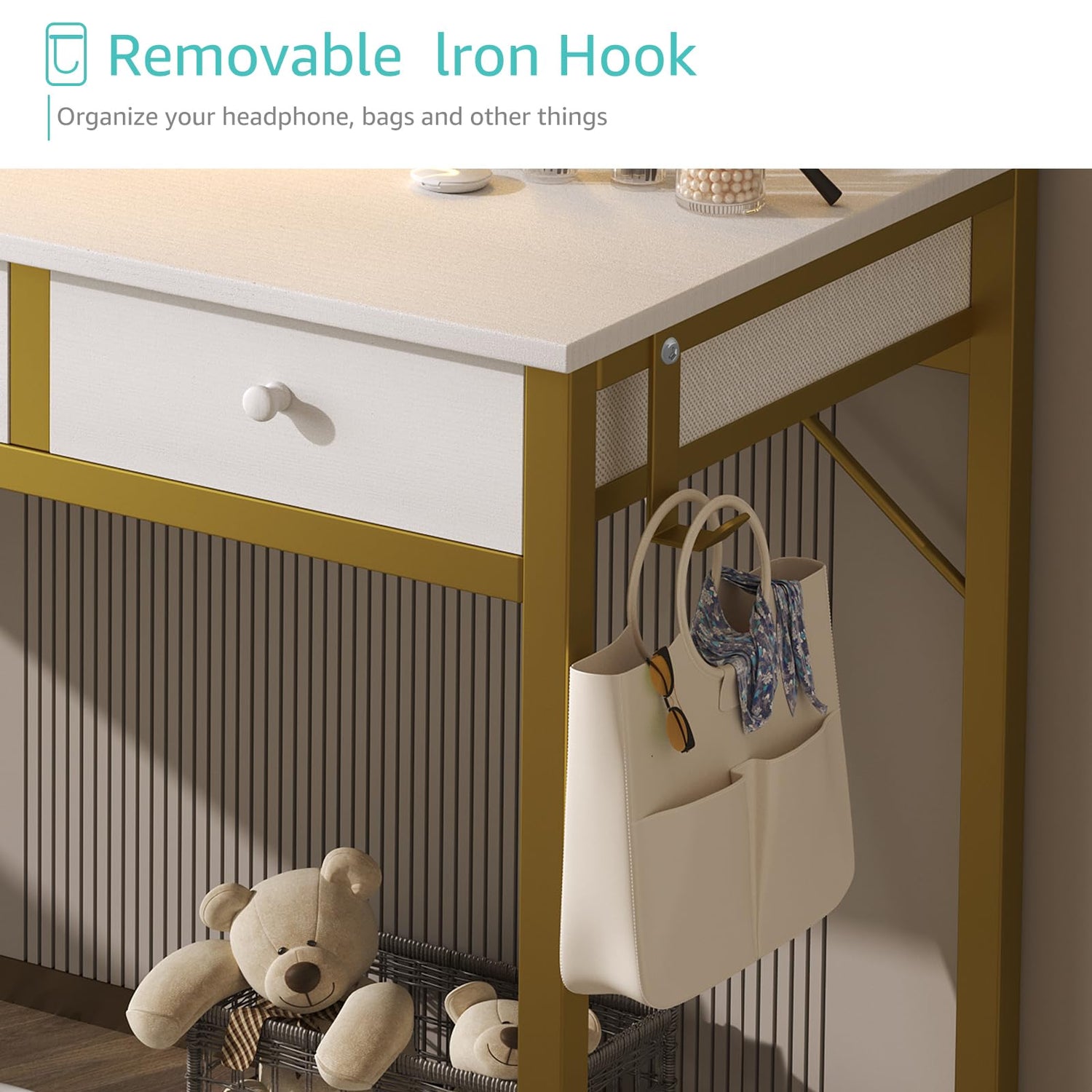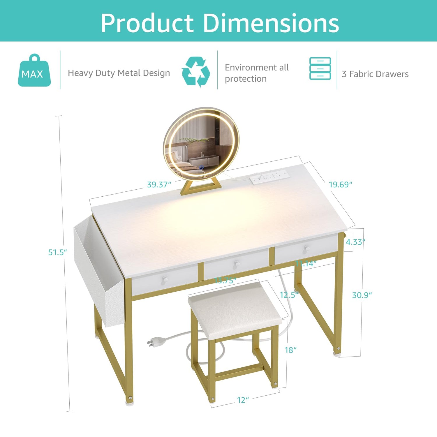 Lufeiya White Makeup Vanity Desk with Mirror and Lights, 40 inch Make Up Vanity Desks with Fabric Drawers & Charging Station, Dressing Table and Chair Set for Bedroom Girls, White Gold
