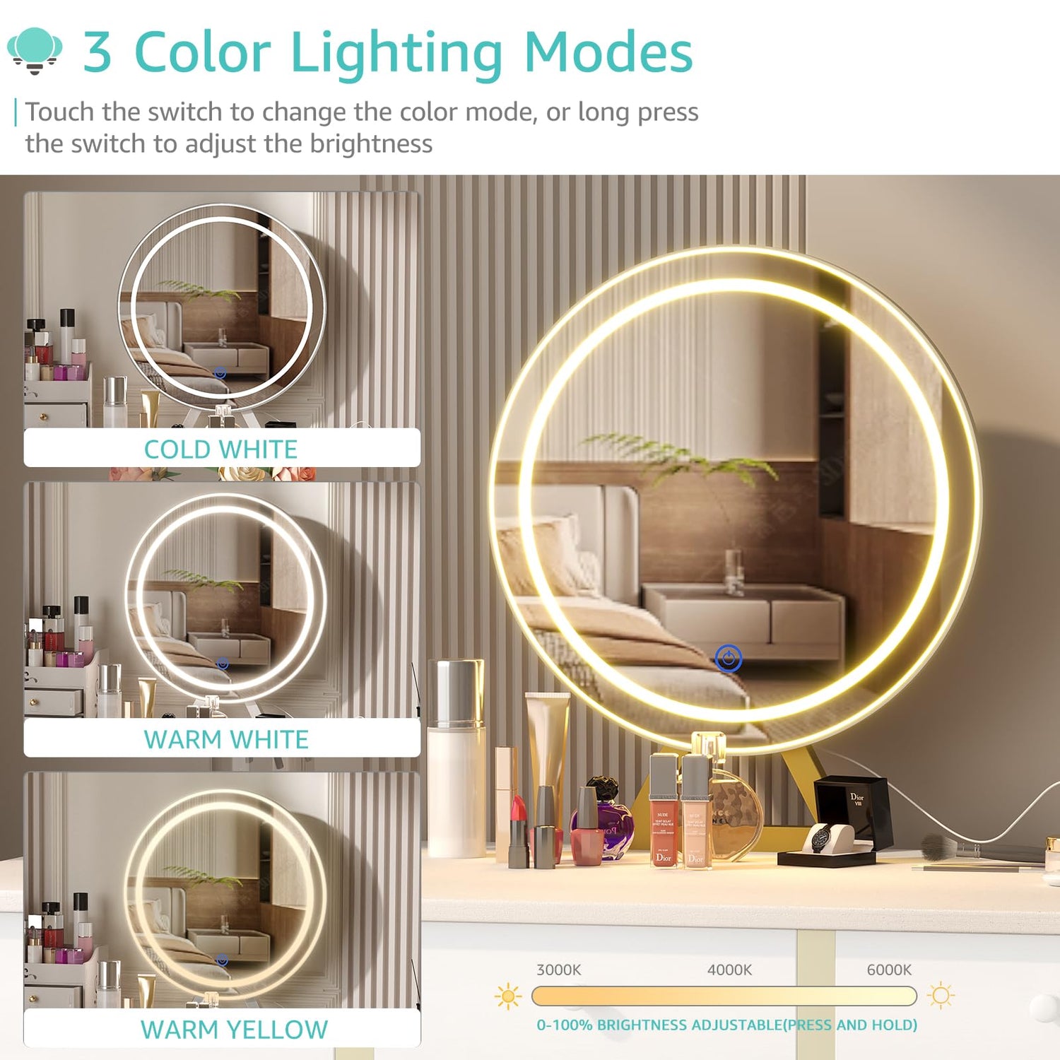 - 【Round Mirror with LED Light】This make up vanity desk comes with a lighted mirror which have 3 different settings: warm yellow, warm white and cold white light colors. Touch the switch to change the color mode, or long press the switch to adjust the brightness.It can meet your different needs, perfect for home make up, salon or live broadcast.