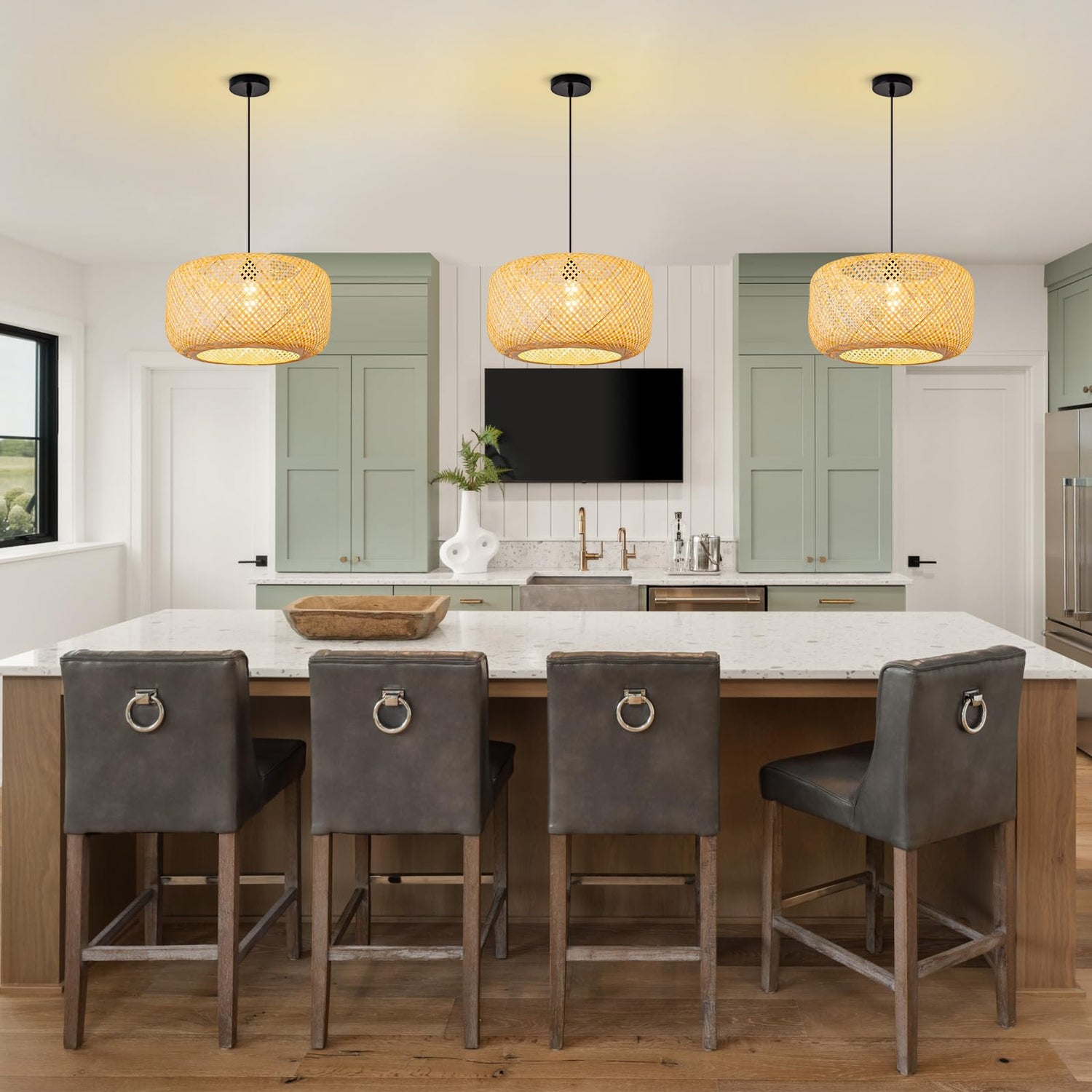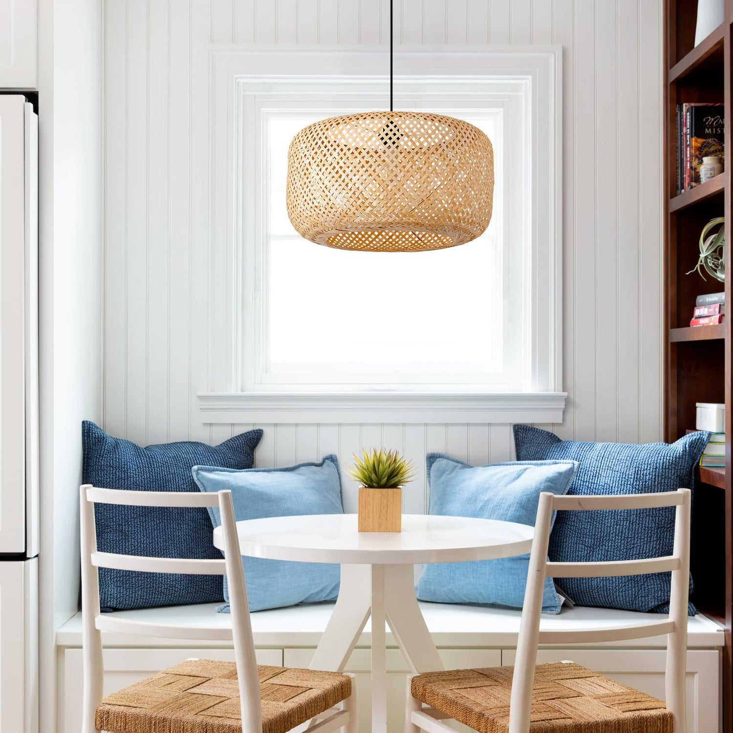 LUJOGUID 17.72in Bamboo Drum Light Rattan Wicker Hand Woven Lighting Fixture Boho Coastal Beach Chandelier Hanging Basket Lights for Kitchen Island Dining Room Restaurant Hallway Foyer
