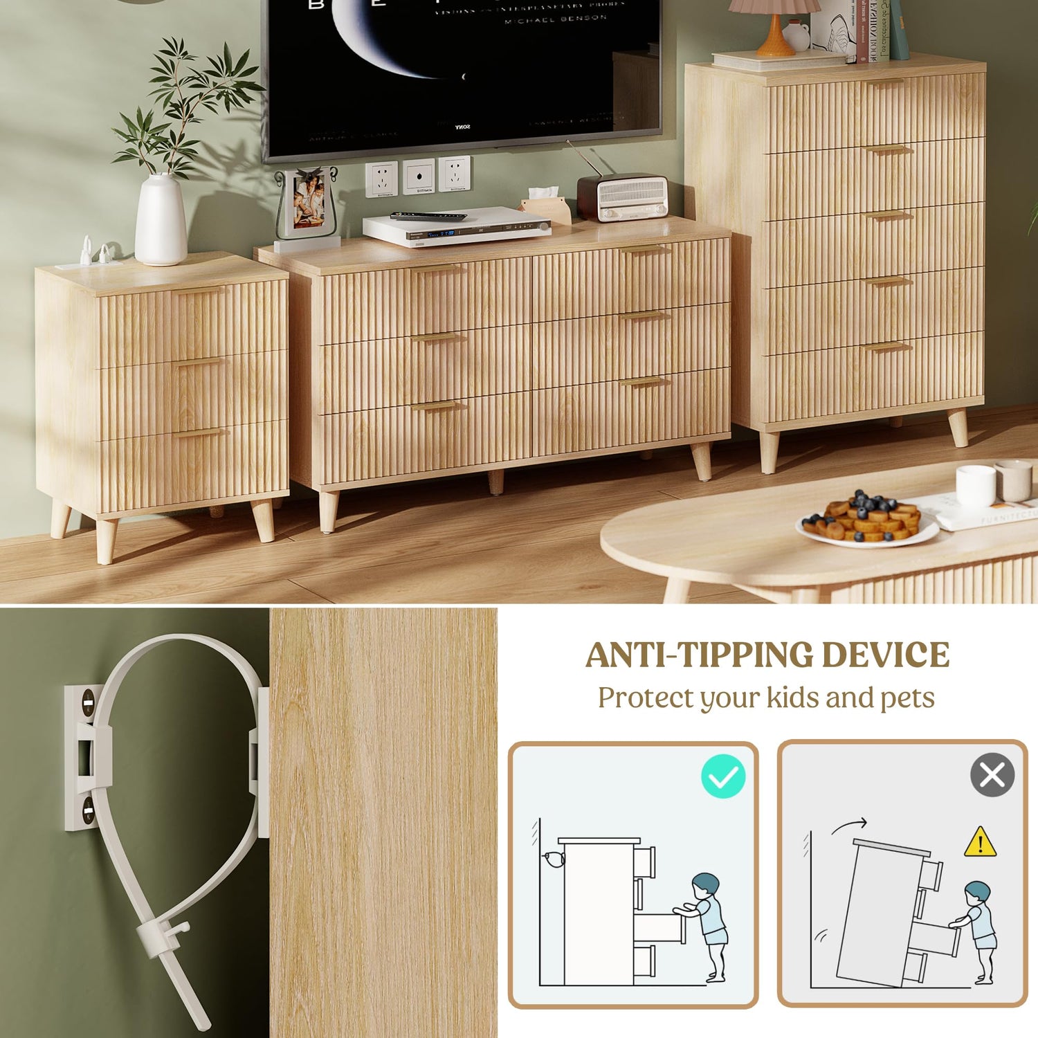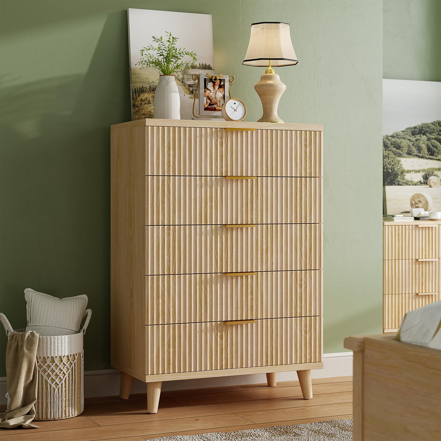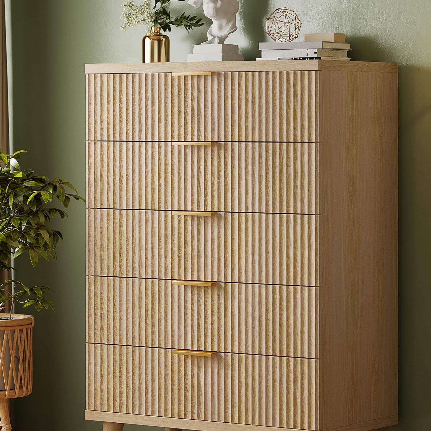 - ELEGANCE MEETS VERSATILITY: Elevate your living space with our chic 5 drawer modern dresser, featuring fluted with natural color for touchable elegance and timeless nature! Wood dresser exquisitely organizes your bedroom, living room, or entryway and is also available as a TV stand.
