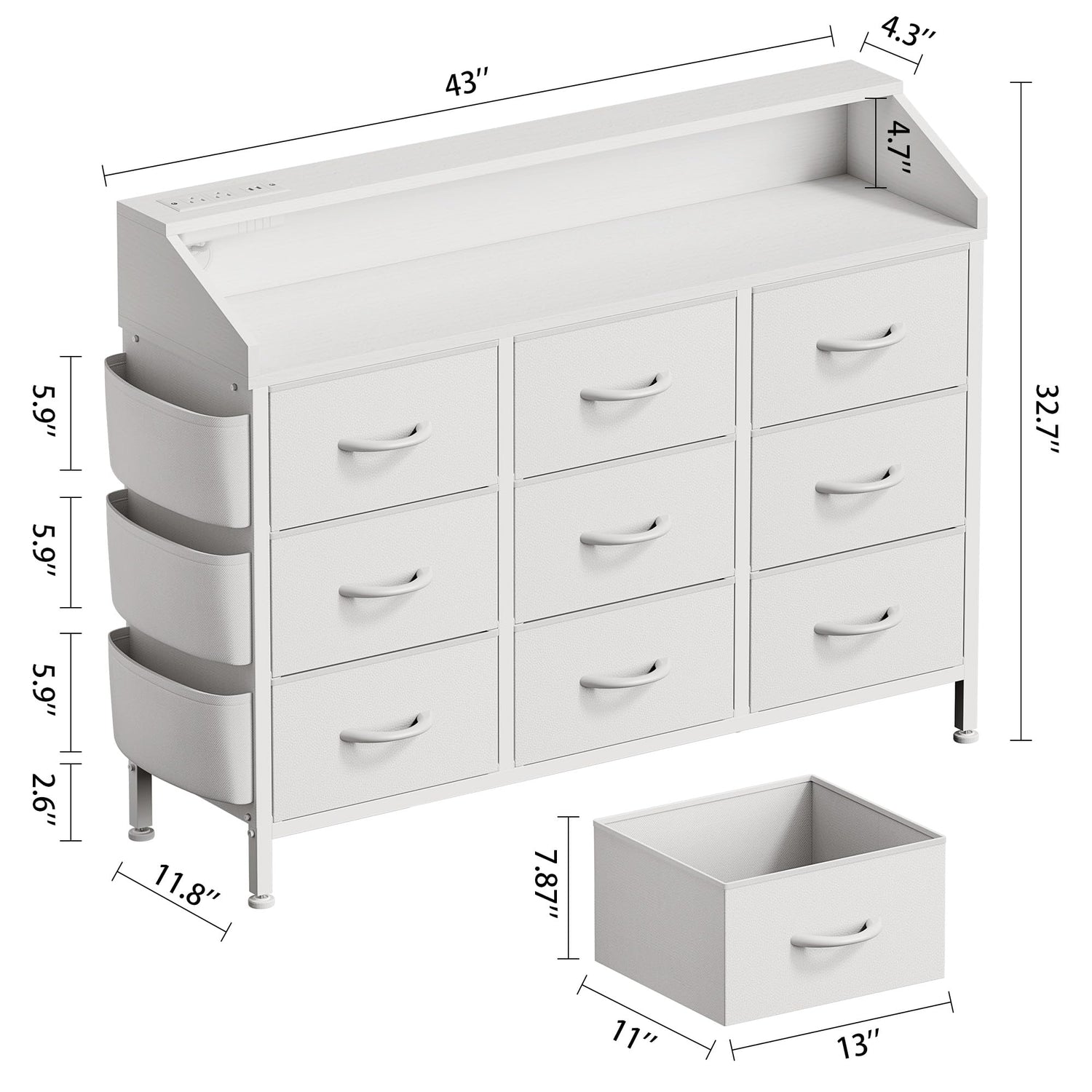 Lulive White Dresser for Bedroom 9 Drawers - Fabric Dressers for Bedroom with LED Light & Charging Station - Kids Adults Chest of Drawers for Living Room Hallway Closet Nursery (White)