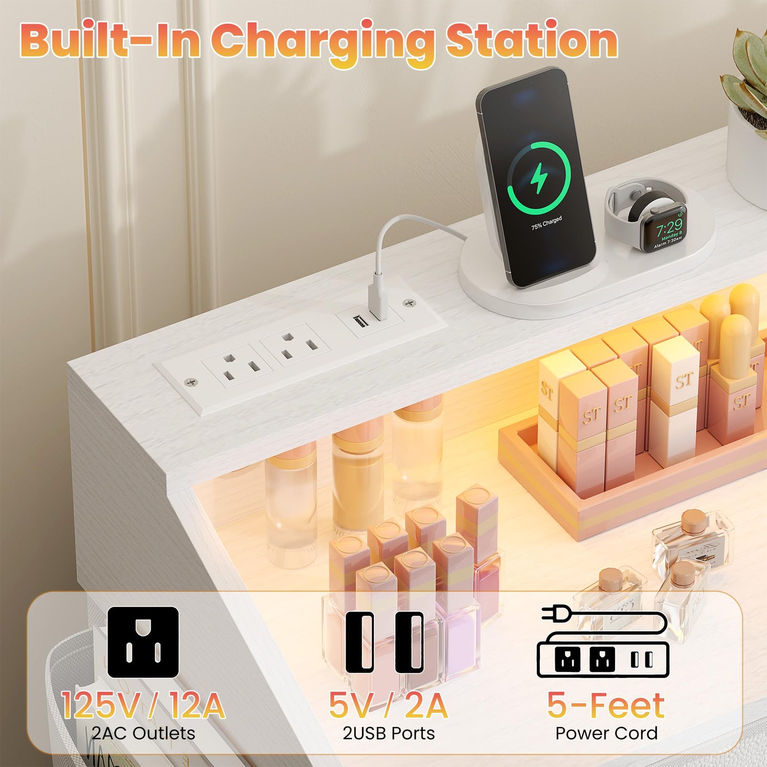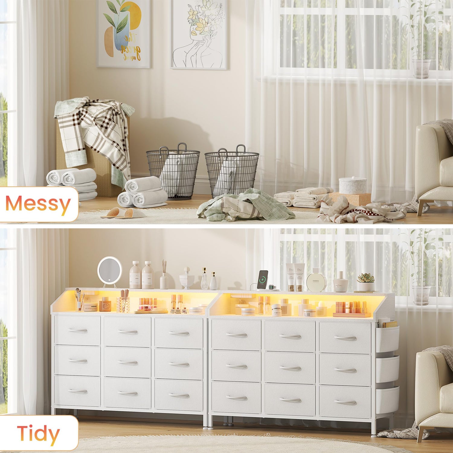 - Charging Station & LED Light: Dressers tabletop's plug design (2 AC outlets and 2 USB ports) gets rid of wires troubles, easy to charge your cell phone, headphones, watch, laptop, desk lamp, and 20 kinds of lights to create all kinds of atmosphere you need.