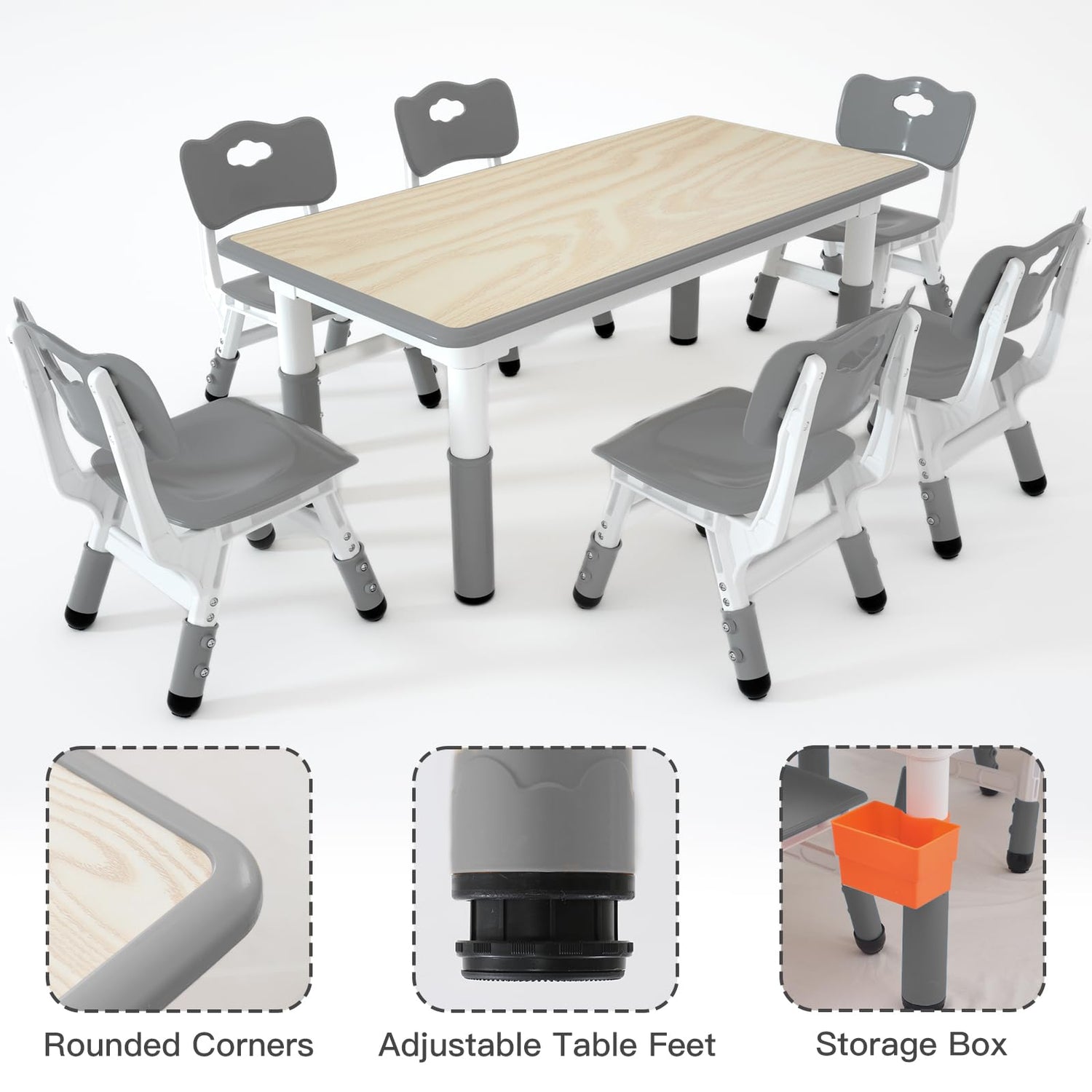 - 1.SAFETY:The kids table and chairs have a stable structure and a maximum load-bearing capacity of 220lbs, which reduces the possibility of tipping and increases the safety of children,The corners of the table are rounded to reduce the risk of children getting hurt