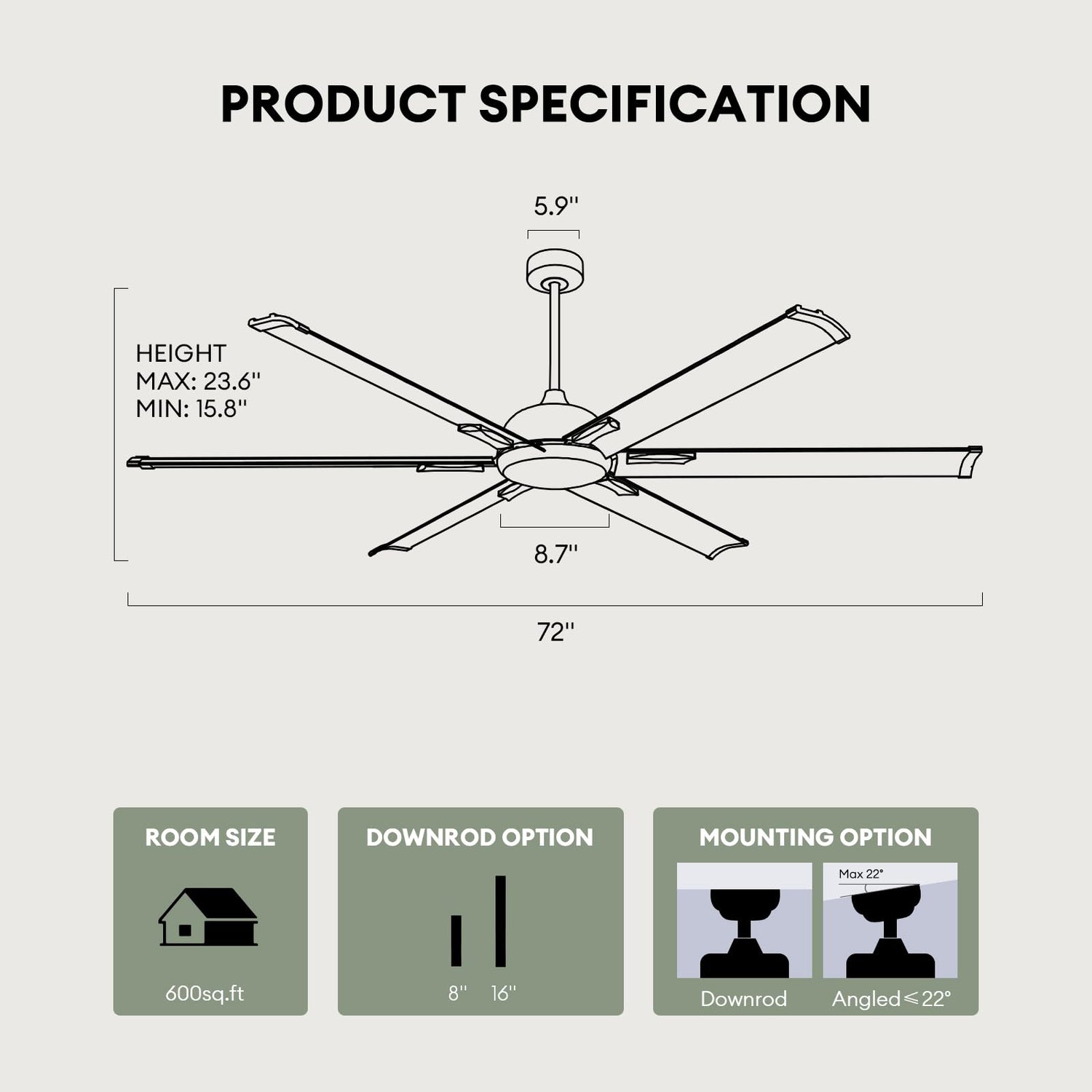 - 72-Inch Large Ceiling Fan: The fan blades are made of 6 pieces of aluminum alloy, which can provide more durable performance and greater air volume than abs and wooden blades. In addition, it has undergone anti-warping and anti-corrosion treatment, which extends its service life. This large industrial-style ceiling fan is perfect for living rooms, garages, gyms, and covered terraces.