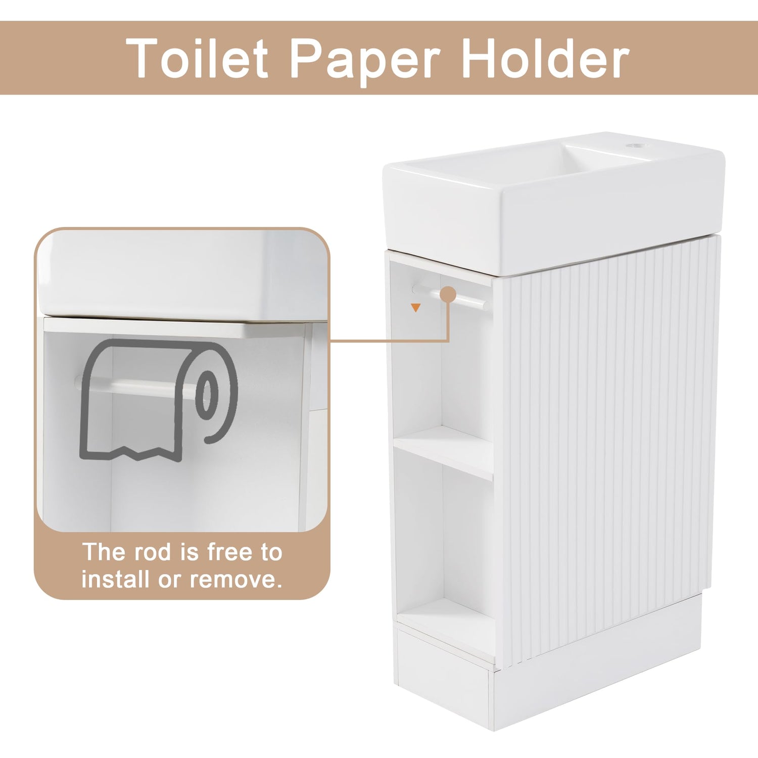LUMISOL 18.6" Small Bathroom Vanity with Sink, Freestanding Bathroom Vanity with Toilet Paper Holder & Soft-Close Door, Left or Right Storage, Wood Bathroom Sink Cabinet with Ceramic Basin, White