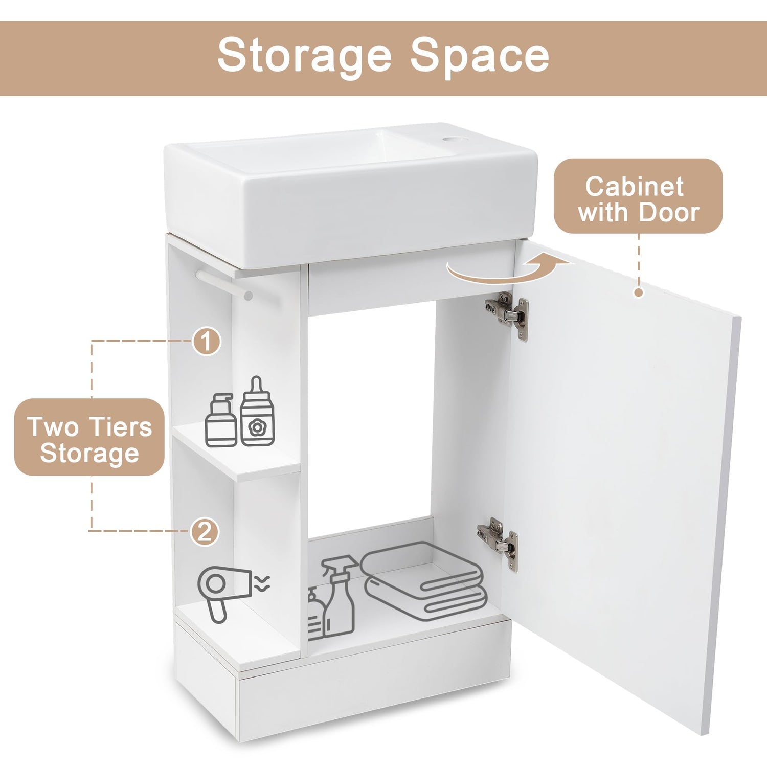 - [Flexible Side Storage]: The bathroom vanity has one cabinet with door, 2-tier open shelf on the side, and toilet paper holder. This bathroom vanity is flexible to install according to your habits. It's up to you to put the shelf and toilet paper holder on the left or right.