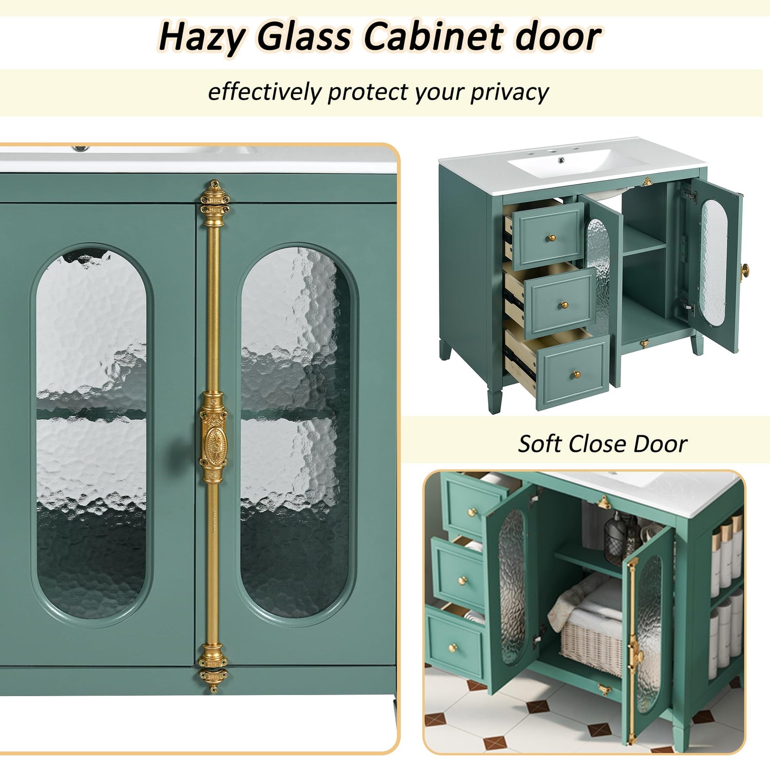 LUMISOL 36 Inch Bathroom Vanity with Sink, Free Standing Bathroom Sink Cabinet with 3 Drawers, 2 Glass Door & Side Storage, Vintage Bathroom Vanities with Ceramic Sink, Solid Wood Frame, Green