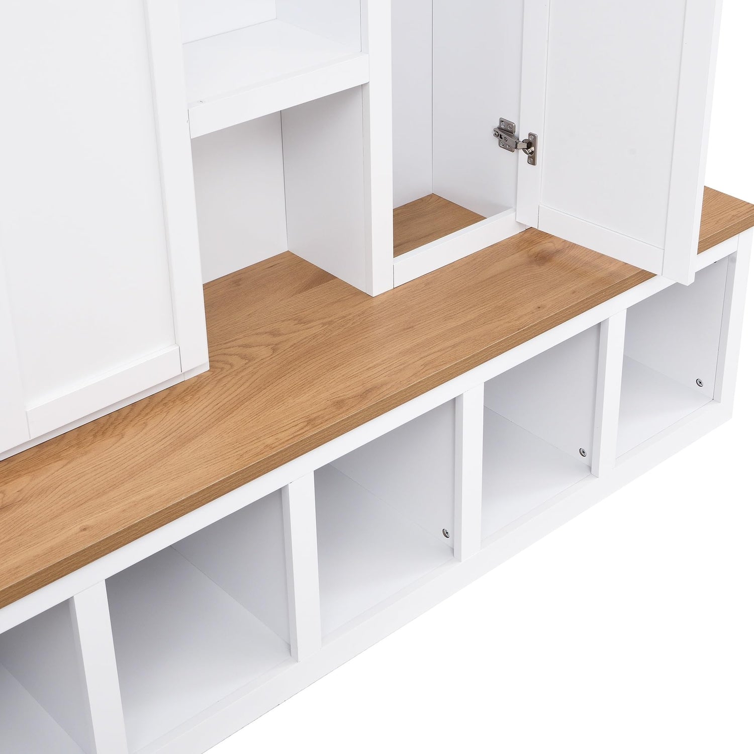 - Entryway Organization: Four internal cabinets with hooks, plus additional side hooks, keep essentials like keys, bags, and umbrellas neatly stored. Open lower and middle shelves offer flexible display or shoe storage.