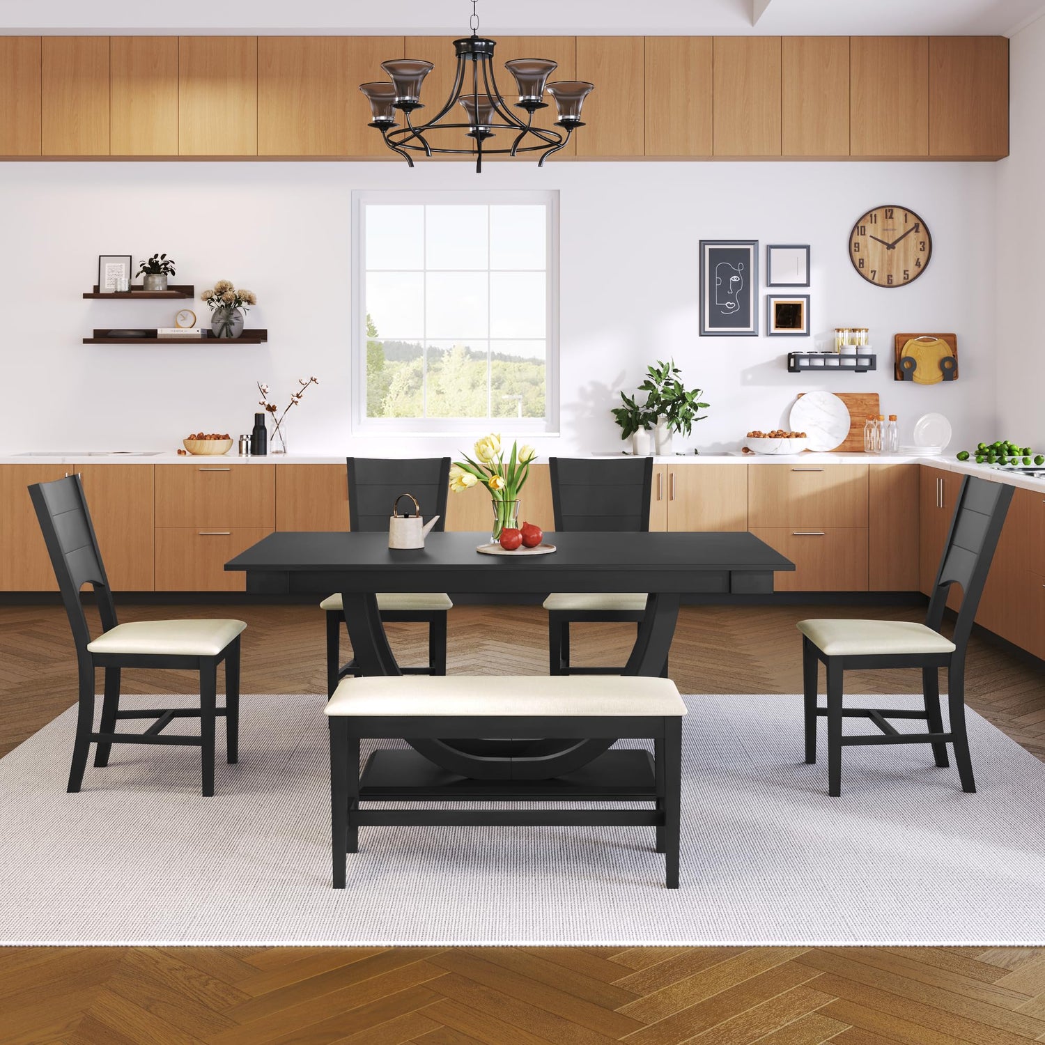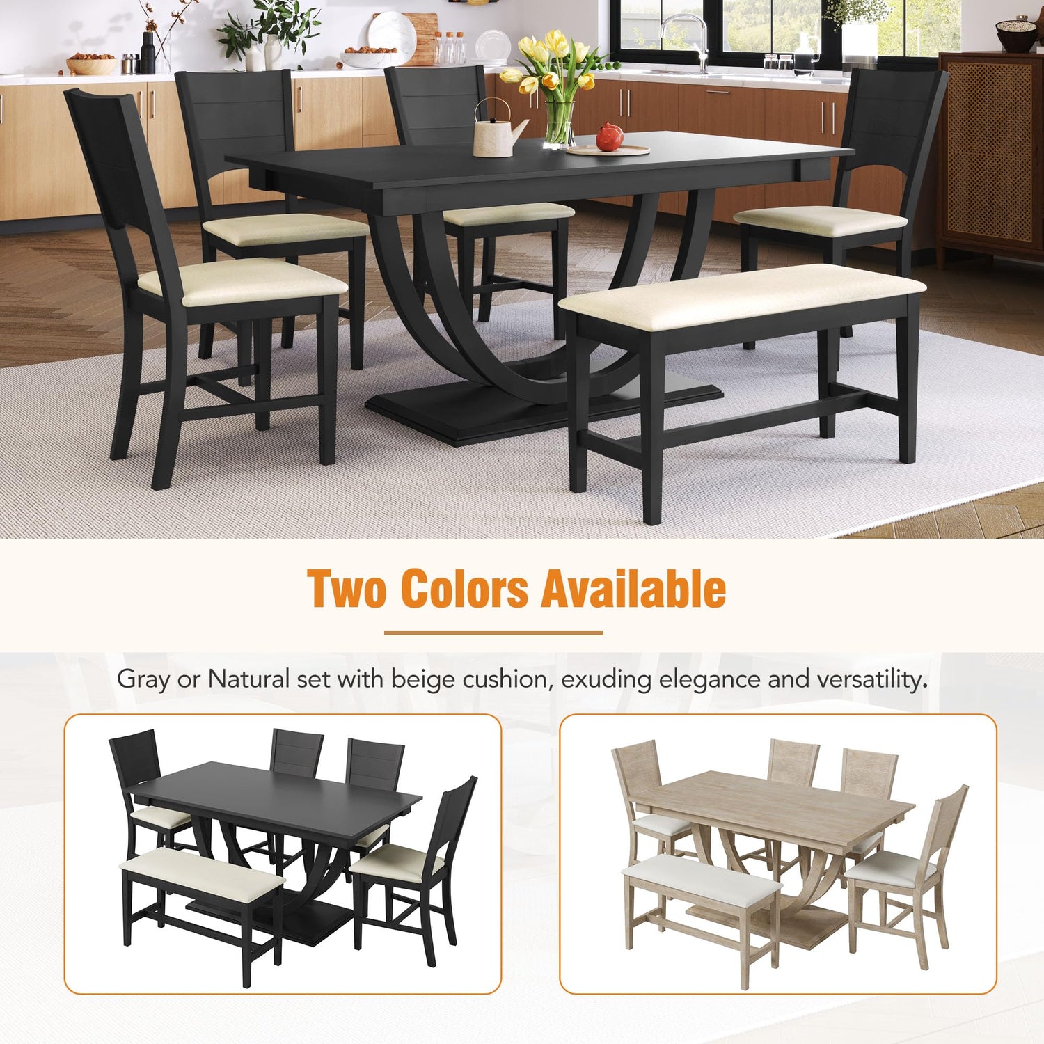 - [Modern Dining table Set for 6] Our six pieces solid wood dining table set experiences a harmonious fusion of modern and traditional design. The collection consists of a rectangular table, four chairs and a bench, all of which have semi-circular legs. Each chair and bench seat has ornate padding that provides comfort and style. This dining table set is suitable for up to six people.