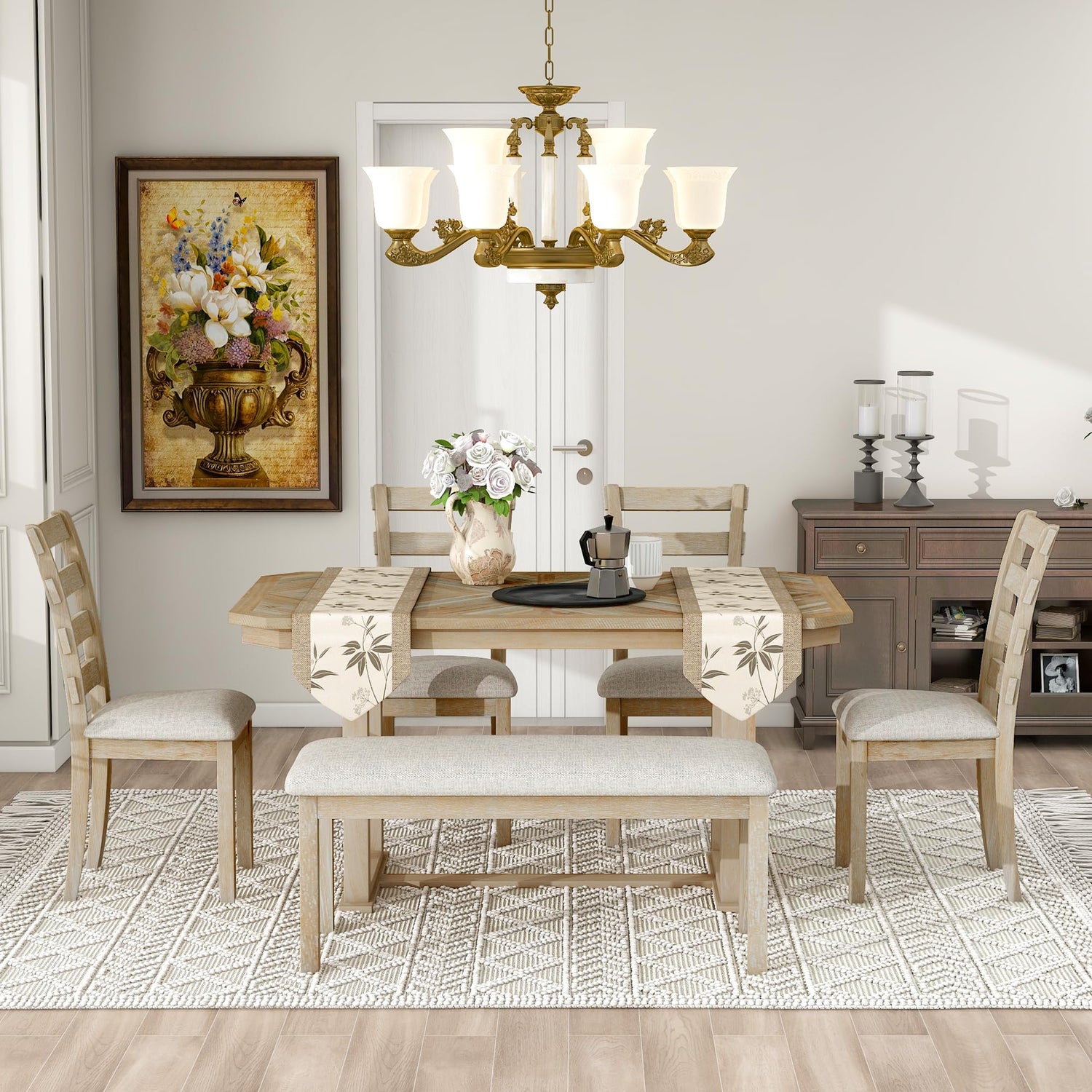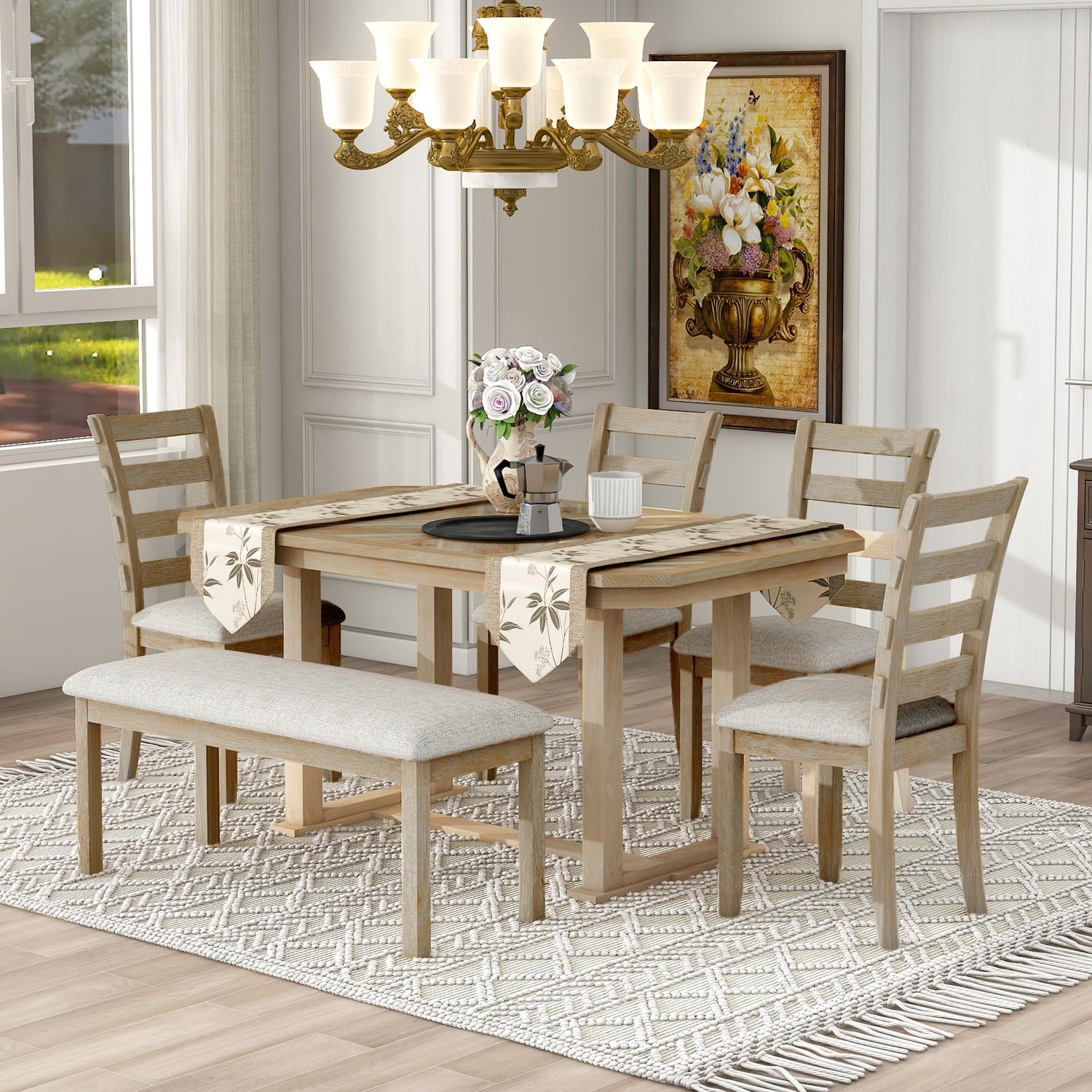 LUMISOL 6-Piece Farmhouse Dining Table Set, Solid Wood Kitchen Table Set with 4 Upholstered Chairs and Bench for Kitchen, Dining Room, Small Space, Natural