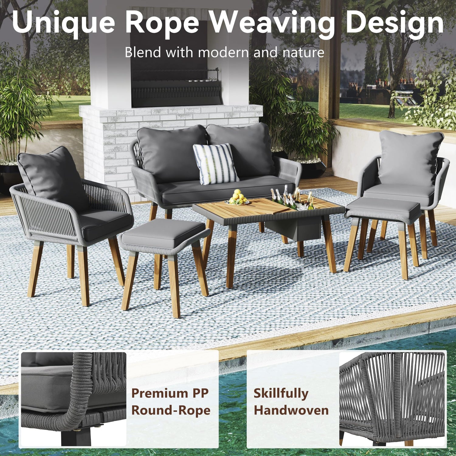 LUMISOL 6-Piece Grey Patio Furniture Set with Acacia Wood Cool Bar Table and Rope Seating
