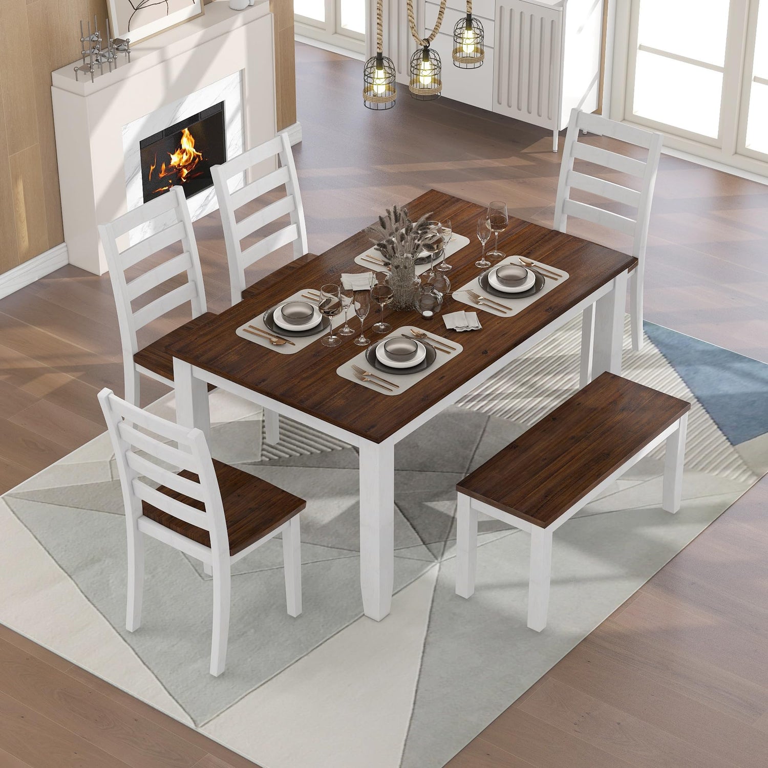 - Farmhouse Dining Room Table Set---This 6-piece dining set is ideal for enjoying home-cooked meals and holiday dinners with friends and family. It includes a table, bench, and four chairs. Each piece is showcase a rusti aesthetics from traditional to the farmhouse.
