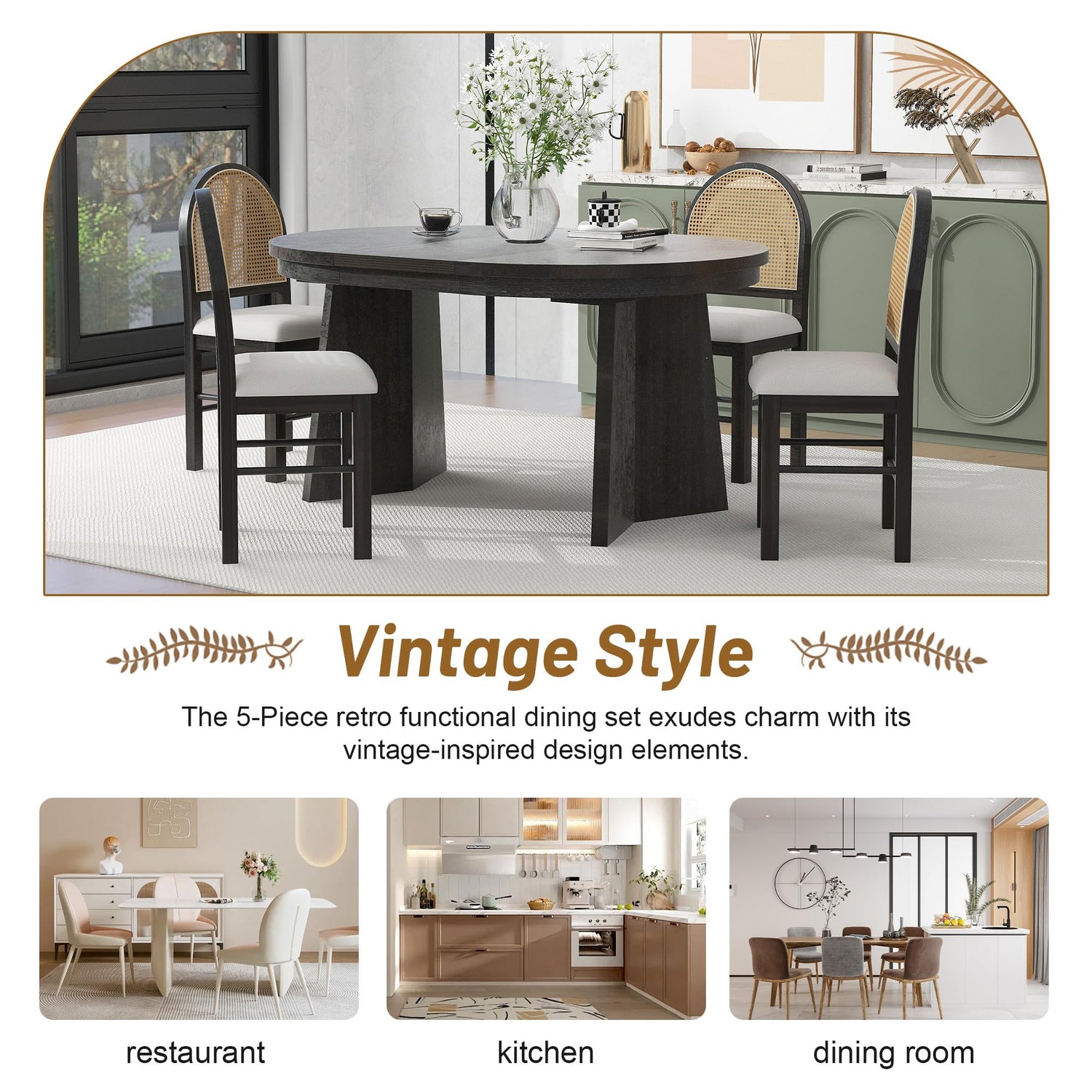 - [Vintage Style]: The 5-piece retro functional dining set exudes charm with its vintage-inspired design elements. The rattan backrests on the upholstered chairs further enhance the retro appeal, creating a cozy and inviting atmosphere for family meals or gatherings with friends. It can bring a retro romantic atmosphere to your restaurant, kitchen area or dining room. There are two colors for you to choose from: natural wood wash and espresso.