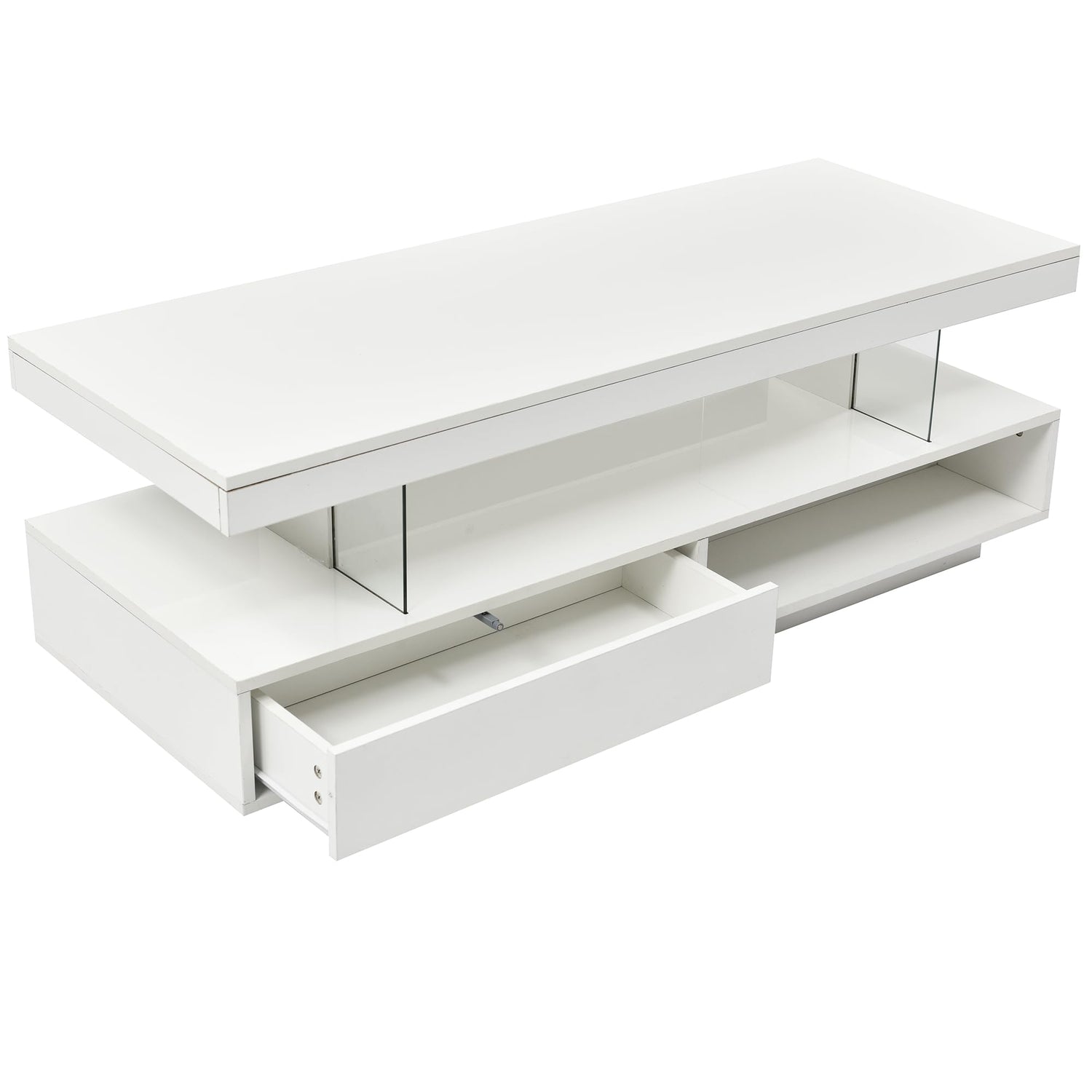 - Clutter-Free Storage: Say goodbye to living room clutter with our modern center table. Beneath the glossy tabletop, there are 2 storage drawer that provide ample space for remote controls, magazines, and other essentials. Open display shelf is perfect for books, decorative accents, or even a small indoor plant.