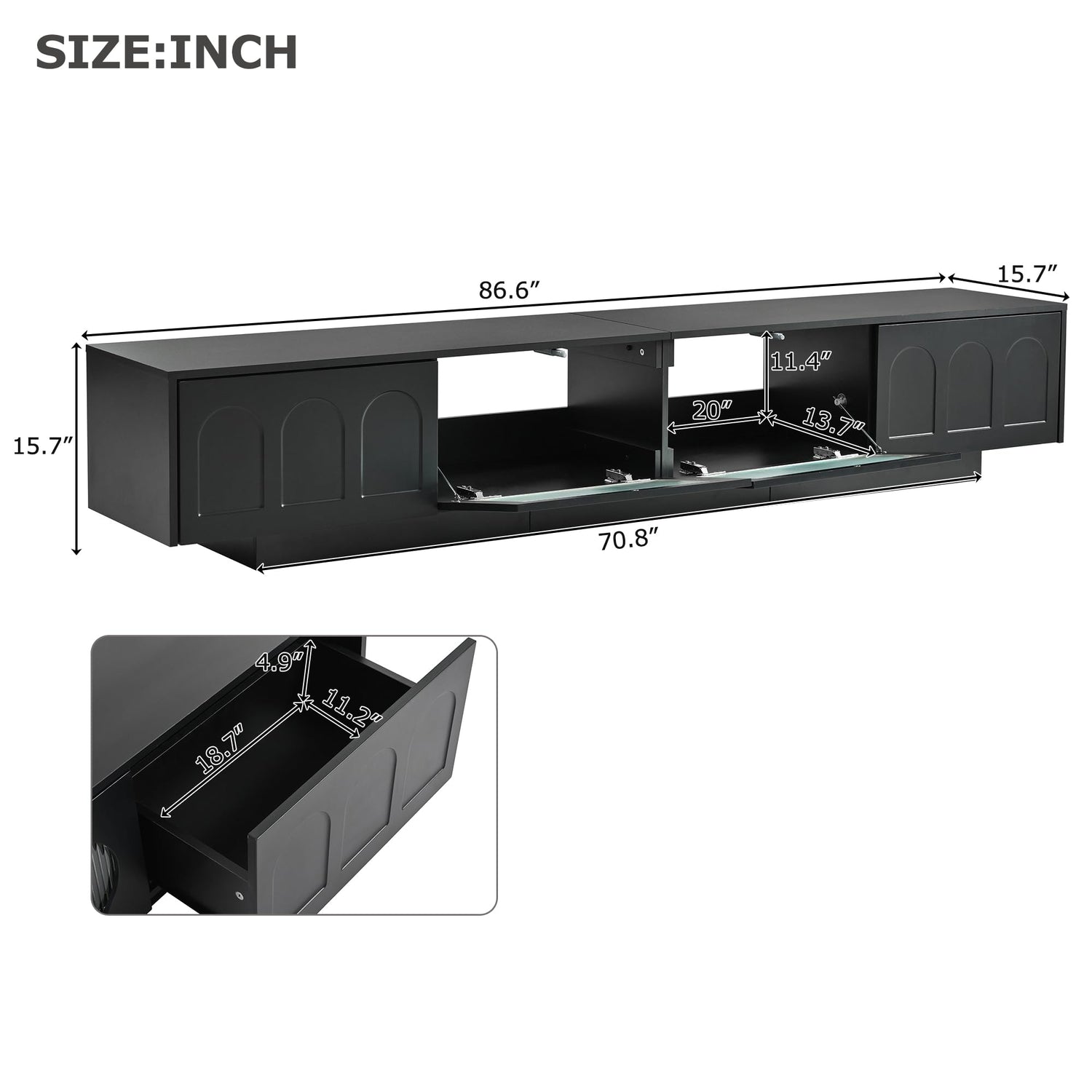 Overall: 86.6”W x 15.7”D x 15.7”H / Drawer: 18.7”W x 11.2”D x 4.9”H / Cabinet: 20”W x 13.7”D x 11.4”H