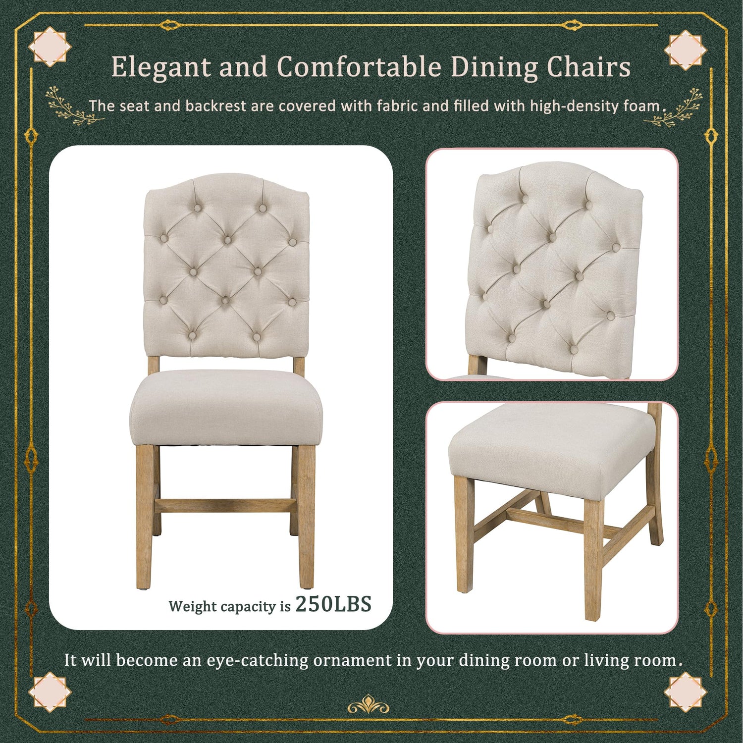 - [Upholstered Dining Chairs] This is a chic dark beige dining chair with both the seat and back covered in fabric and filled with high-density foam. Its graceful lines, rear horn legs and delicate button-tufted details are elegant and thoughtful in design. No matter where it is placed, it will become a striking decoration in your dining room or living room. Rubber wood chair legs are strong and durable to ensure service life and fixed years.