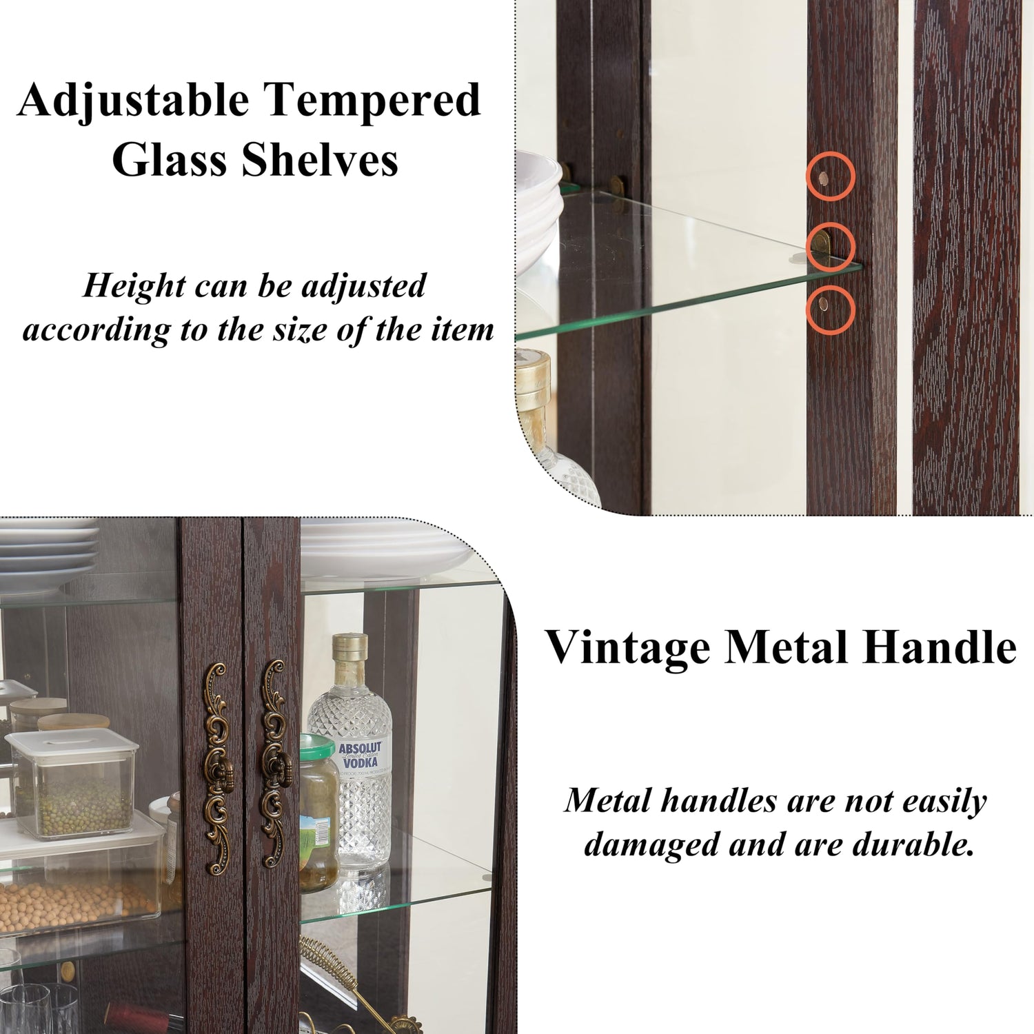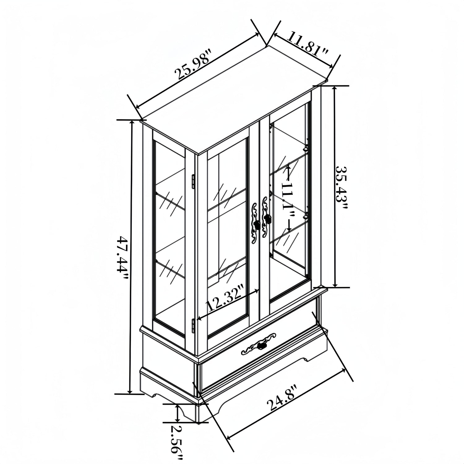 Spacious and Elegant Cabinet:This exquisite curio cabinet, featuring glass doors, boasts a total of 3 shelves and a big drawer that offer ample and versatile storage space. It includes one fixed wooden shelf and two adjustable tempered glass shelves, each capable of holding between 15 to 22 pounds. This cabinet is perfect for storing books,wine and collectibles.