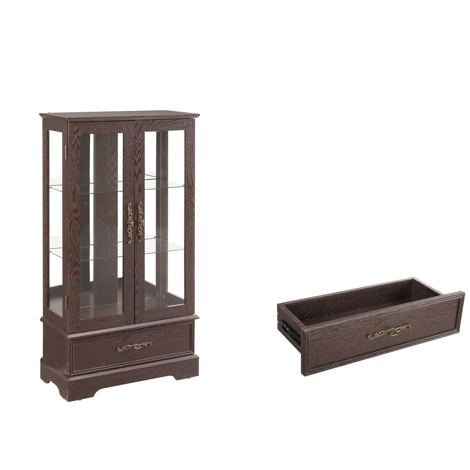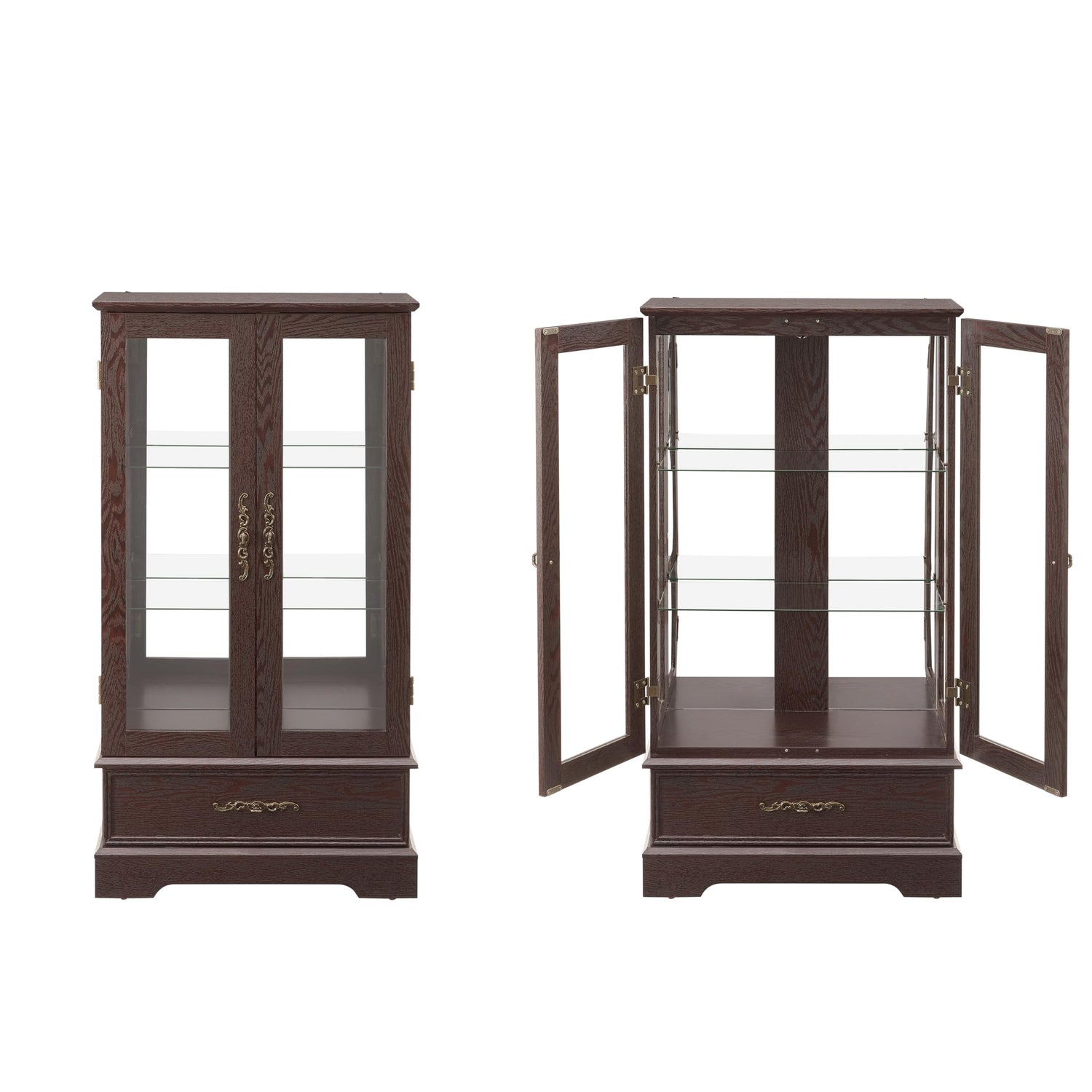 - 【Sturdy & Durable】Made of sturdy tempered glass,Solid and composite wood. This exquisite curio cabinet, featuring glass doors, boasts a total of 3 shelves and a big drawer that offer ample and versatile storage space. It includes one fixed wooden shelf and two adjustable tempered glass shelves, each capable of holding between 15 to 22 pounds. This cabinet is perfect for storing books,wine and collectibles. Simply move the shelf pegs into the desired pre-drilled hole height to adjust the tempered glass shelves.