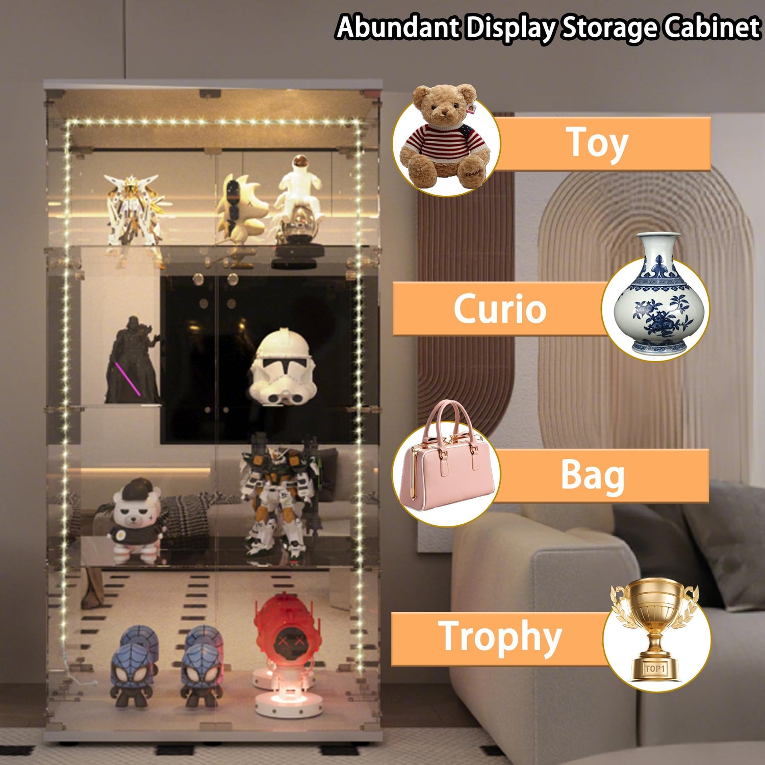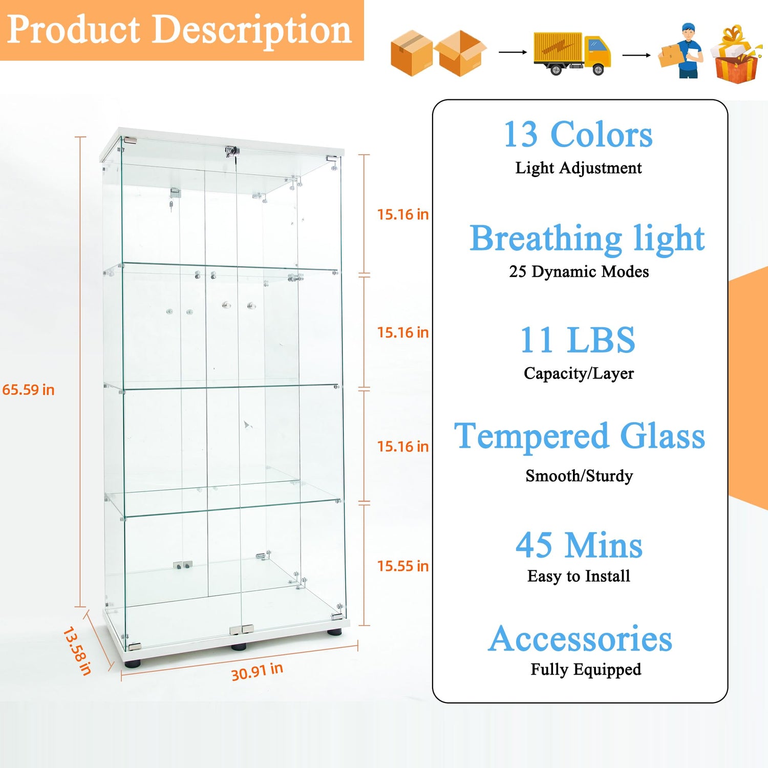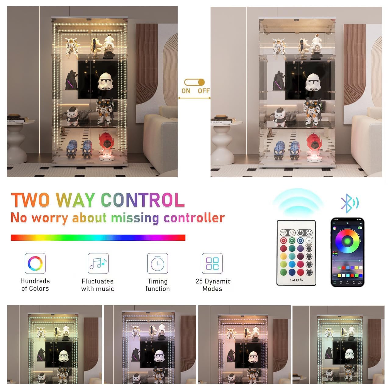 - 【LED Light Glass Display Cabinet with Mirror Back Panel】This 4 shelf 2 door glass display case with LED light strips allows you to create the atmosphere you want in your space with beautiful lighting. You can control the strip via a mobile connection, choose from 25 dynamic modes or adjust the colors in the app (hundreds of colors). the LED strip's breathing mode dances to the rhythm of the music around you, senses your presence and shines, mirroring the light reflected on the mirrored back panel of the glass, creating a beautiful light show. It is not only a glass storage cabinet for displaying collectibles, but also an elegant art exhibit that adds a touch of sophistication to your home.