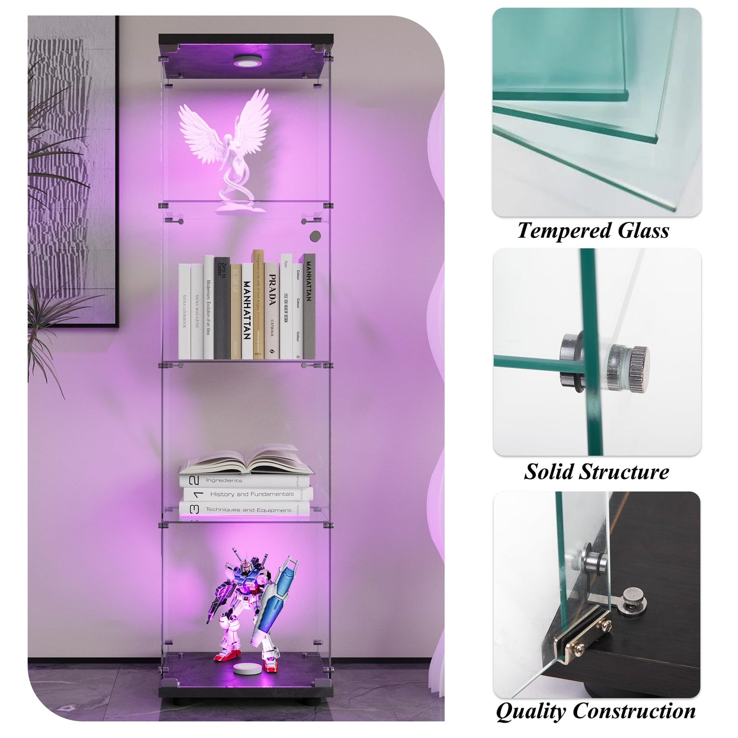 lunhung Glass Display Cabinet 4-Shelf with LED Lights and Lock,Curio Cabinets Upgraded Quick-Install Storage Cabinet,Glass Floor Standing Bookshelf for Bedroom,Living Room(Black)