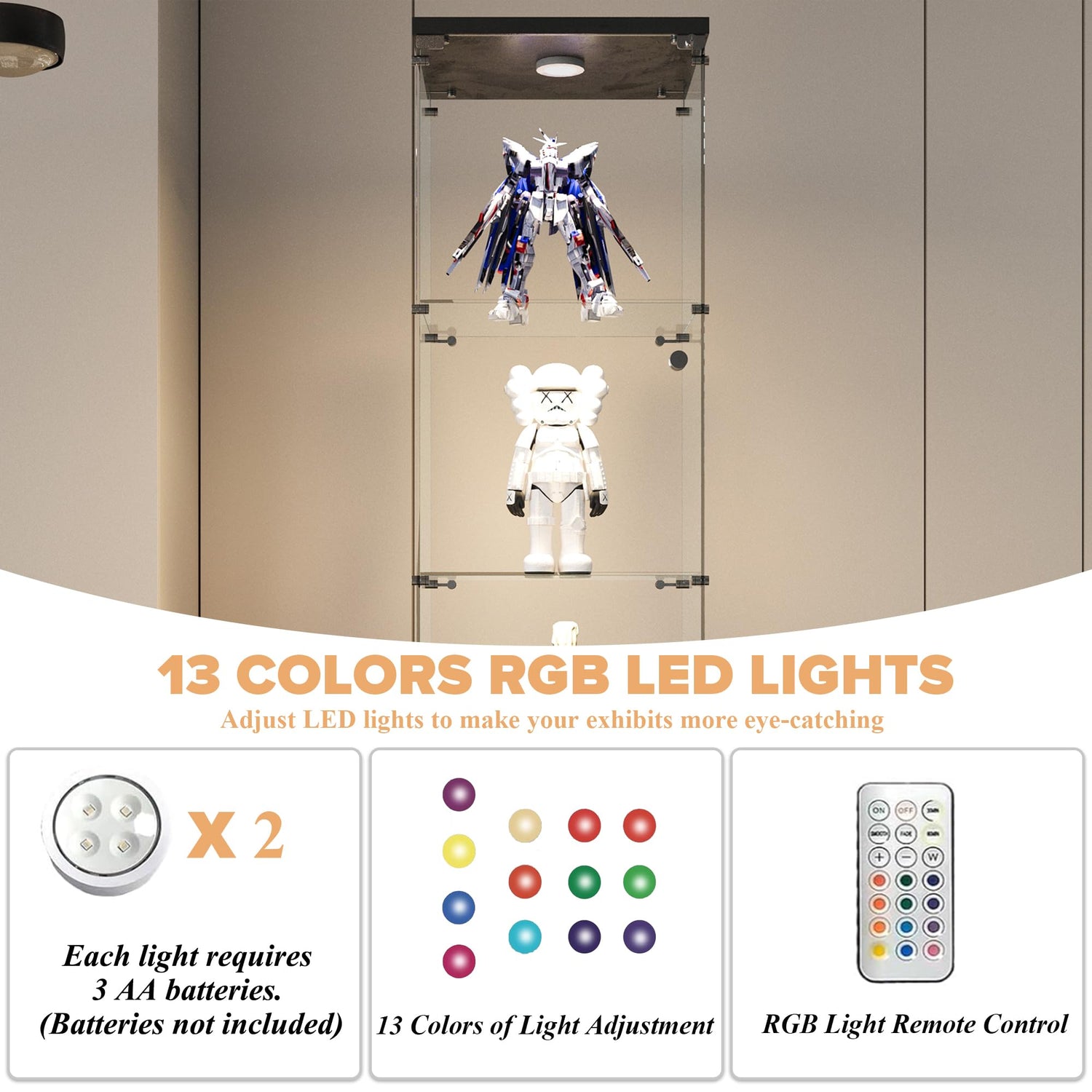 - 【Glass display cabinet with LED lights】 This glass display cabinet comes with 2 LED lights, no wiring required, 13 colors can be controlled by remote control, and can display your items under different lights. You can easily store your items in this beautiful glass display cabinet, which can display your exhibits well.