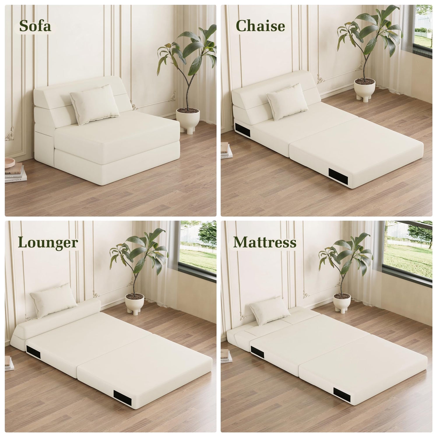 Luoxiao Folding Sofa Bed Convertible Sleeper Chair with Pillow Fold Out Couch Memory Foam Floor Mattress Portable Futon Sofa Bed Lazy Sofa for Living Room/Dorm/Guest Room/Home Office, Twin, Off White