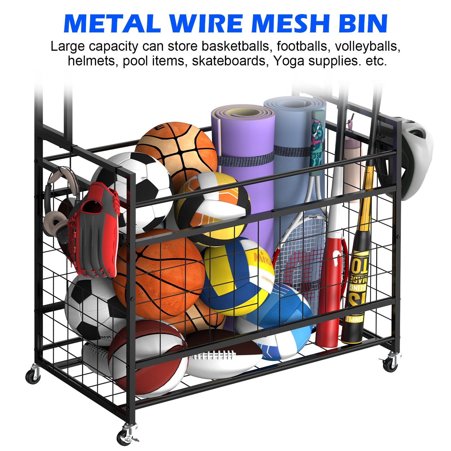 Luplom Sports Equipment Organizer Garage Ball Storage Rack for Sports Gear and Toys, Basketball Holder Stand with Basket and Hooks Rolling Ball Carts with Wheels for Indoor/Outdoor Use, Black