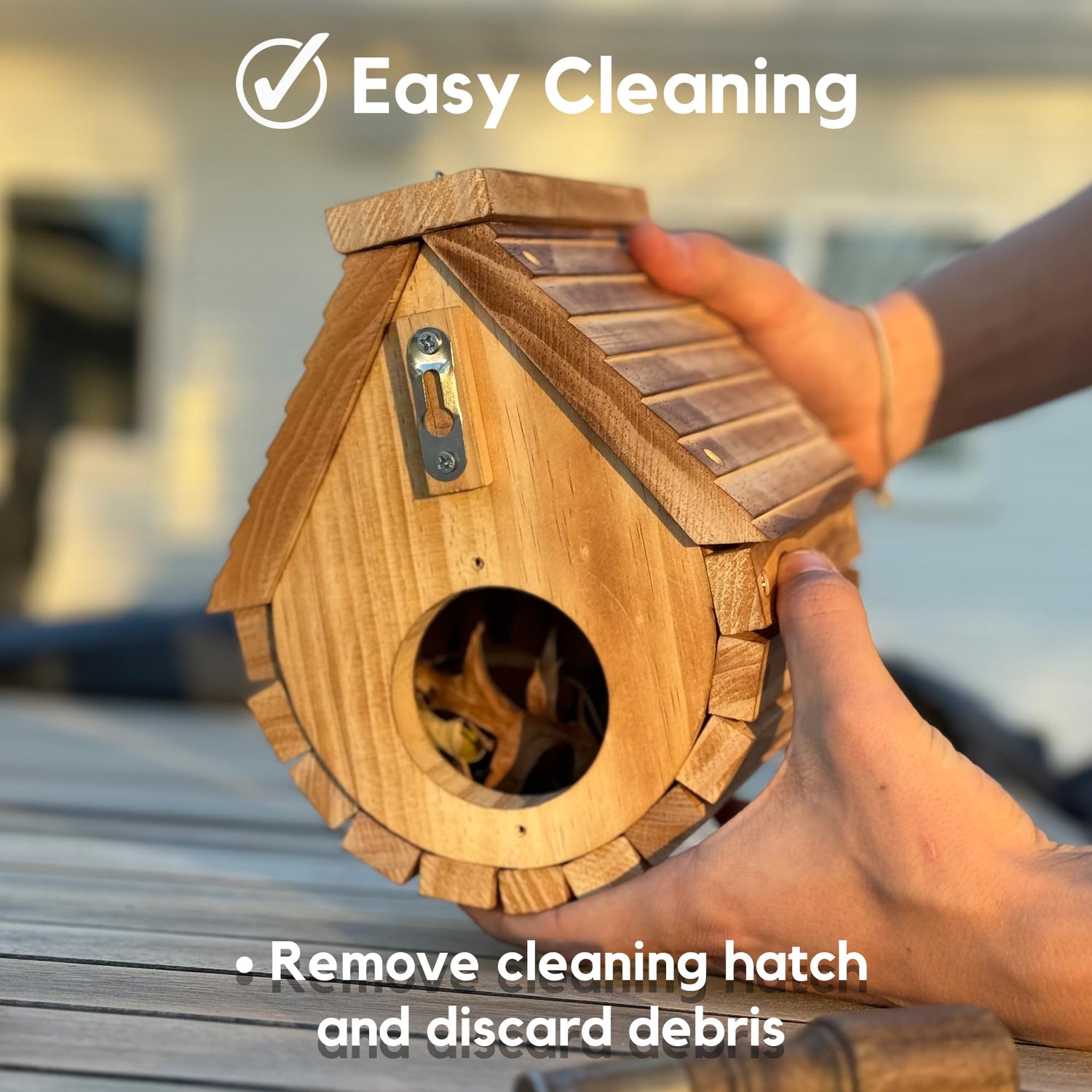 - [DESIGN] Our wood bird house offers a perch for easy entry, a large cleaning door, hardware to either hang or mount the birdhouse, and drainage and ventilation holes to keep birds safe.