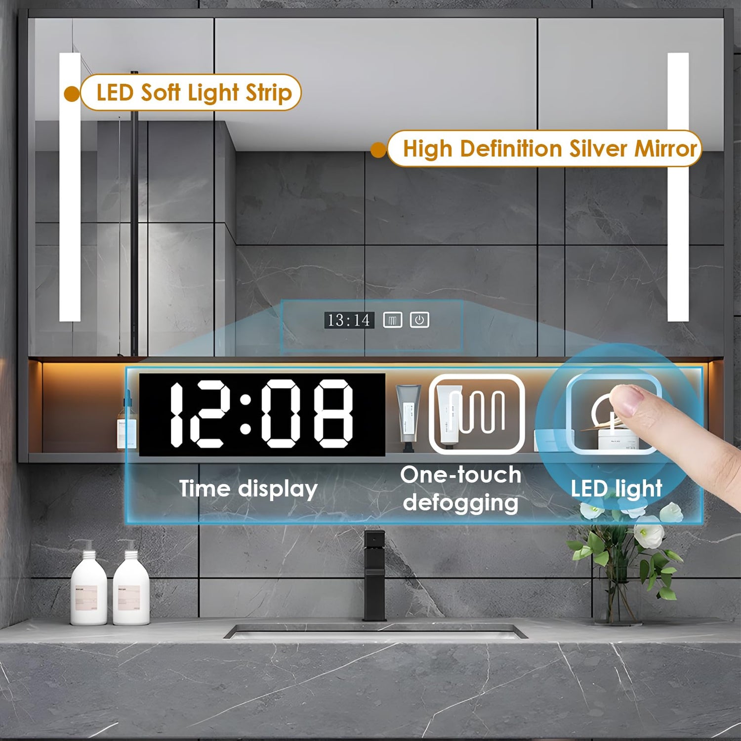 - LED SMART DEFOG MIRROR CABINET:The LED smart defogger mirror, located on the upper part of the bathroom vanity, features soft LED lighting. With a single touch, the defogger function activates, quickly clearing water mist after bathing.
