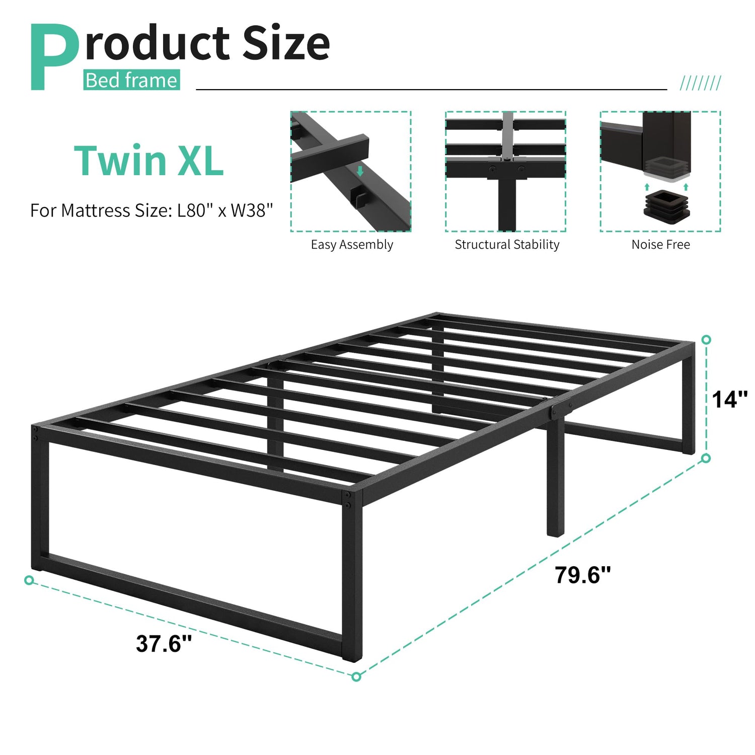 Lutown-Teen 14 Inch Twin XL Bed Frames Heavy Duty Sturdy Metal Platform Bed Frame No Box Spring Needed, Noise Free, Easy Assembly, Black